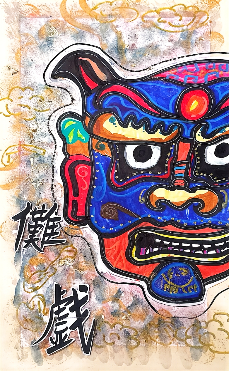 这幅画聚焦陕西秦腔的"净角"脸谱——浓艳的蓝红撞色、夸张的眉眼獠牙,是秦腔脸谱标志性的"粗粝鲜活",藏着陕西人"吼秦腔"的泼辣底气。秦腔是陕西的文化魂,这类脸谱既带着戏曲里的角色性格,也裹着老陕骨子里的热辣劲儿,这幅画用浓烈笔触,把秦腔那股"响彻关中"的烟火气场,画成了看得见的民俗张力。