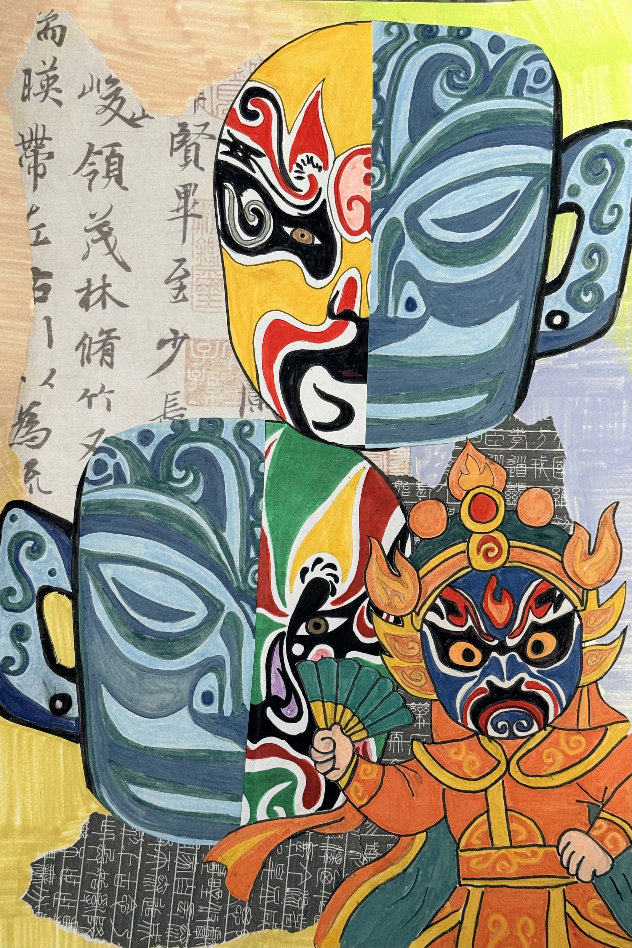 前阵子看了四川变脸表演,那些花花的脸谱太好看啦!后来又听老师讲三星堆,那个大眼睛的青铜面具好神秘哦~我就想:要是它们遇到一起会怎么样?所以我把脸谱和青铜面具剪开来、拼在一起,一半是五颜六色的变脸脸,一半是蓝蓝的三星堆面具,像不像在玩"变变变"?旁边那个拿扇子的小人,就是正在变脸的演员呀!背景的旧纸字,是我特意贴的,感觉一下子就有古代的味道啦!我觉得传统文化凑在一起,是神秘的!