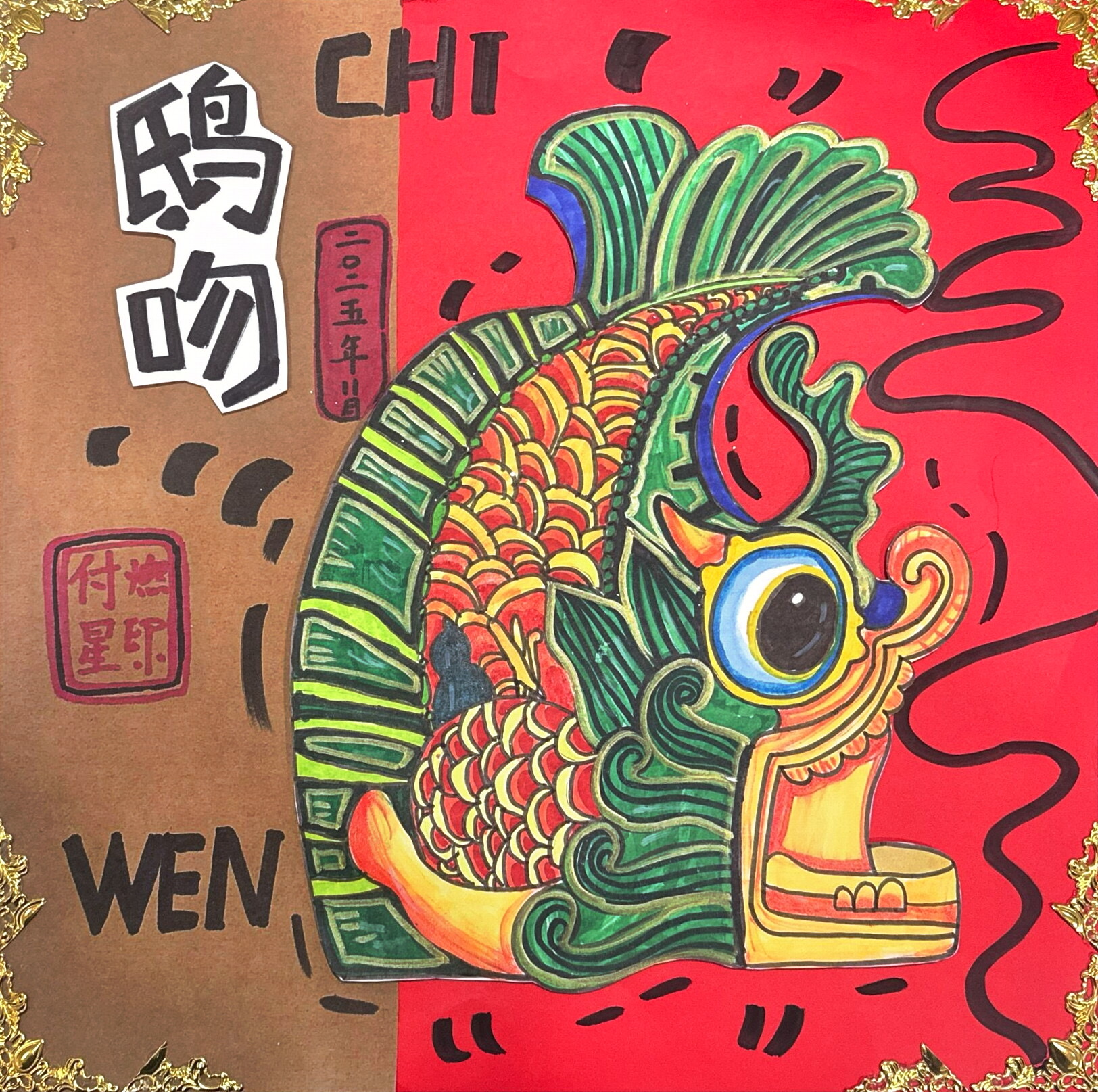 这幅作品聚焦陕西古建构件"鴟吻",串联起三秦的历史与民俗,鴟吻是陕西传统建筑(如西安古城墙、唐代宫殿遗址)的屋脊瑞兽,作品还原其"鱼龙结合"的造型,纹饰借鉴凤翔泥塑的明艳风格,红、绿撞色契合关中民间"以瑞兽祈福"的文化习惯;鴟吻在陕西古建中象征"镇宅避火",是长安作为古都建筑文化的缩影,也藏着三秦人家"以物寄吉"的生活智慧;手绘与拼贴结合,让古建构件跳出"建筑符号"的框架,变成承载陕西历史文脉的艺术载体,传递出"古建瑞兽里的长安韵,纹饰间的关中情"