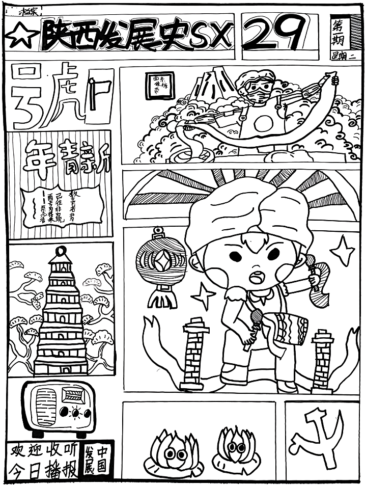 这幅漫画式作品聚焦陕北的"古今交响":既有延安宝塔、陕北秧歌道具(红绸、腰鼓)这类黄土高原的文化符号,也有广播、现代建筑元素,呼应陕北的发展变迁;画面里的陕北娃形象、"青年新声"的文字,藏着陕北从黄土烟火到时代新貌的鲜活气息——既保留了安塞腰鼓、陕北民俗的本土底色,也透着这片土地的新生节奏,是陕北"老味道"与"新活力"的生动碰撞。