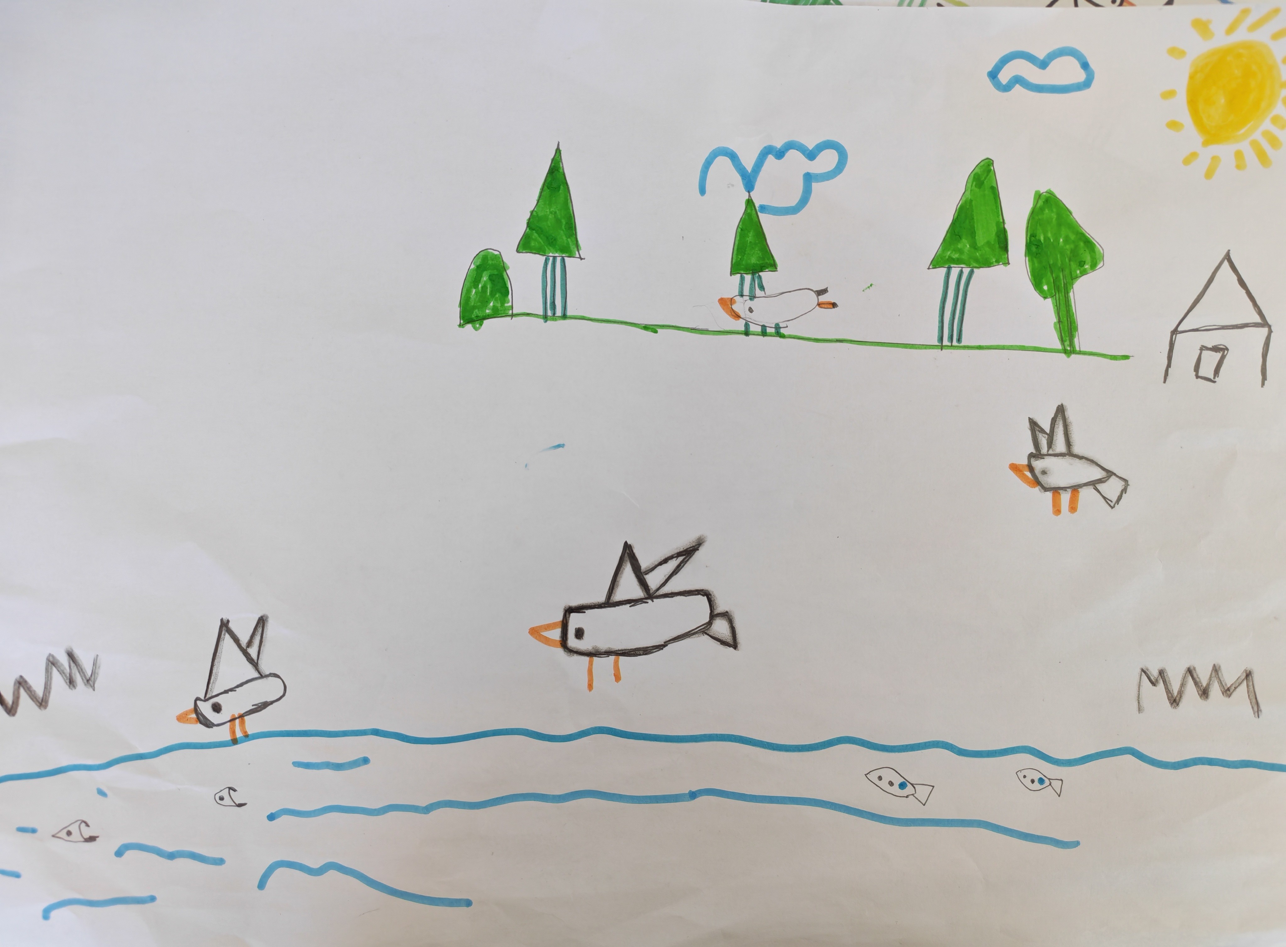我画画的时候,就想着把放学路上看到的小河画下来啦:左边那蓝蓝的波浪是我见过的河水,里面的小鱼是我偷偷看到它们游来游去的样子~天上飞的、河里飘的都是小鸟,我觉得它们肯定在和小鱼玩捉迷藏!右边的绿树是我家楼下的树,太阳一晒,整个河边都暖乎乎的。