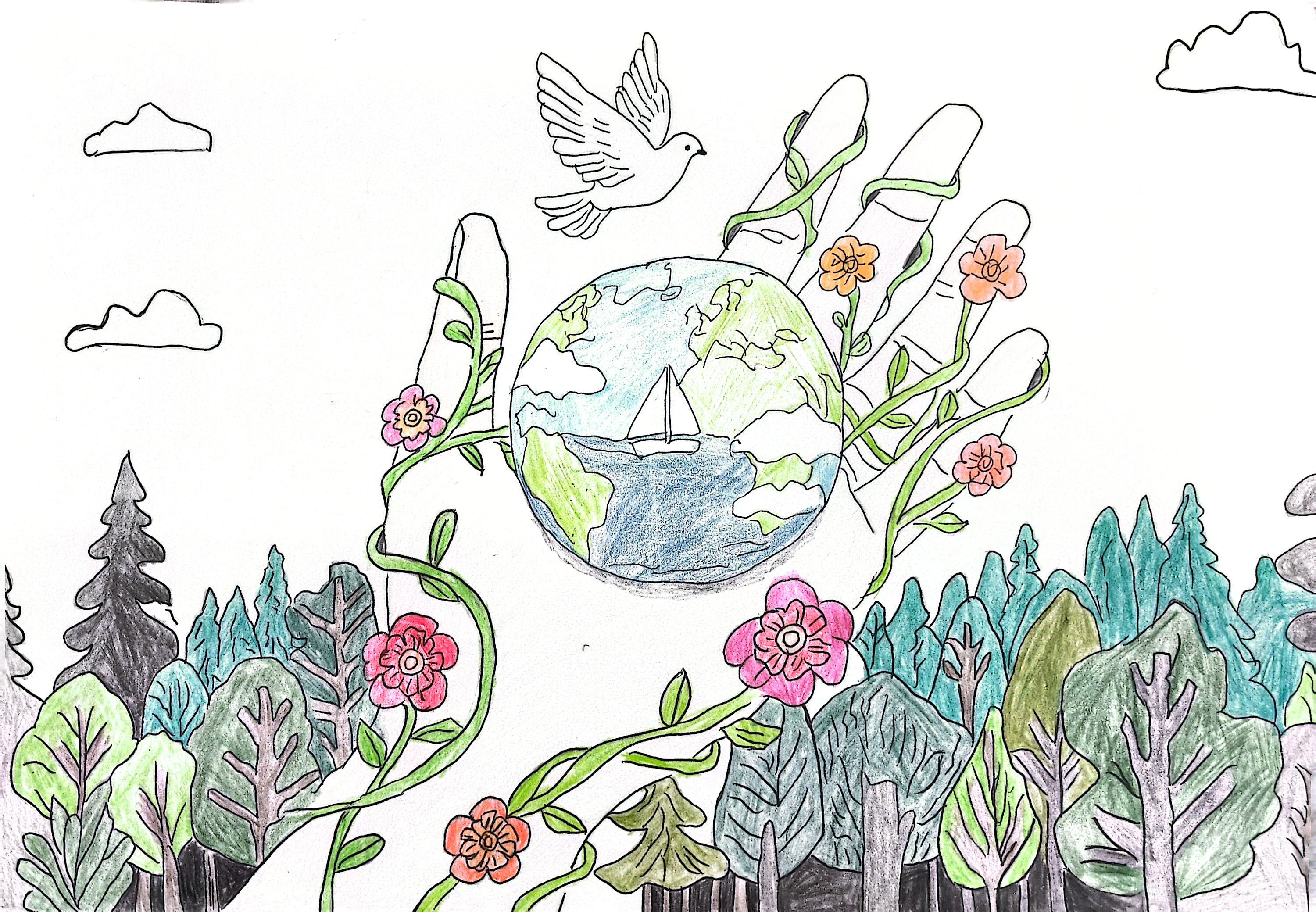 地球是我家,爱护靠大家。在我的作品中,主要体现出一只缠绕着鲜花的手托着一个干净,简单的地球.反肇地球是庞大的,但是需要我们每个人去爱托它,鲜花的意义是我们要做一些善事,如随手拾一下地上的自色垃圾等,最后,才会有一个漂亮舒适清新的家!