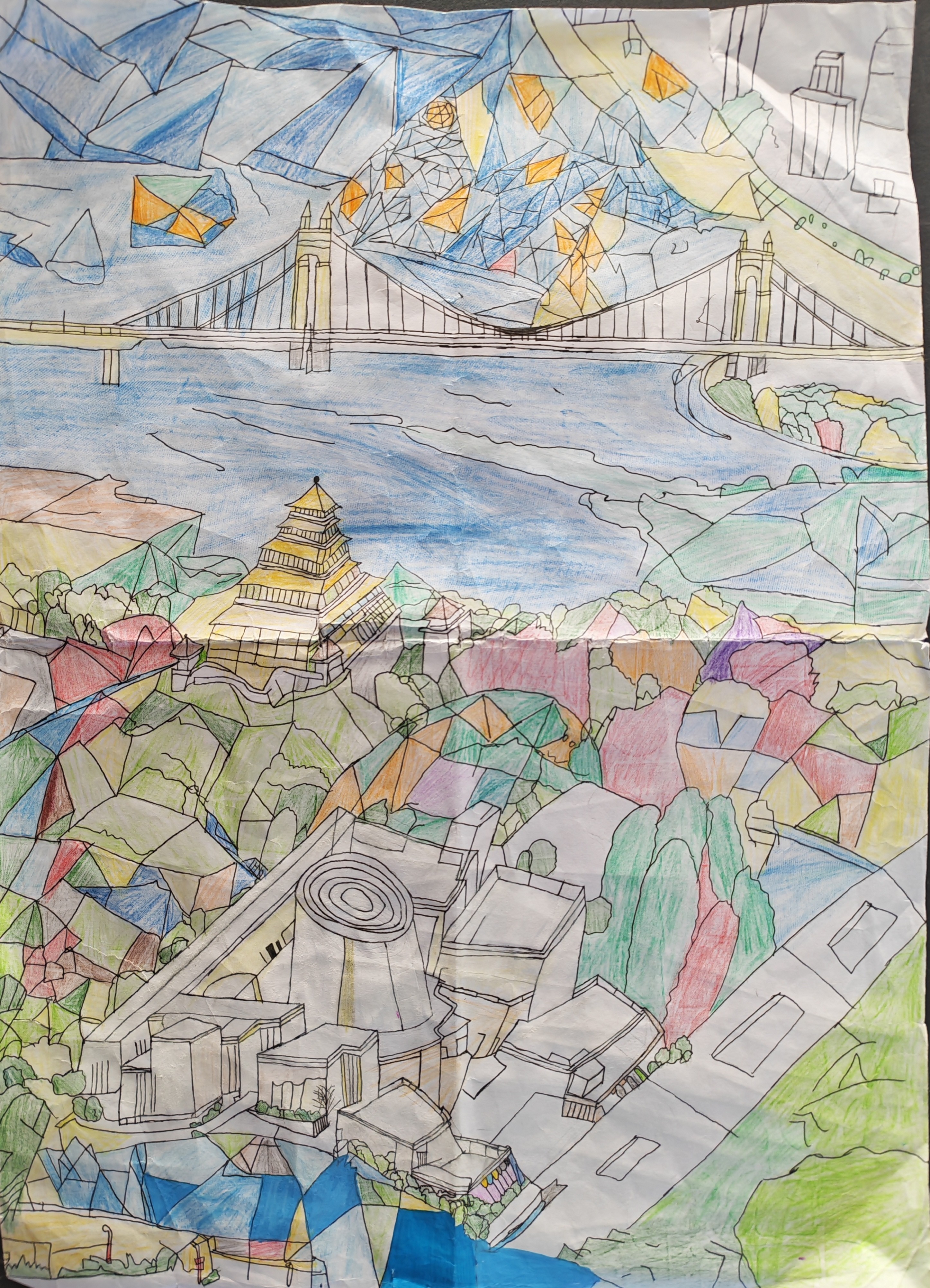 这幅画是我心里"新旧城市的折叠拼图"。我把西安的地标拆成了几何碎片:你看上面那座大桥是现在的城市动脉,下面的塔是老城区的古建记忆,中间的现代建筑群是新商圈——我故意用彩色碎块把它们"拼"在一起,就像我们每天生活里,走着新修的路、路过老楼、抬头又看见新地标,过去和现在本来就是叠在一起的呀!天空里那些发光的几何块,是我想象里城市的"未来碎片"——说不定以后的建筑会像这样,和老地方嵌得更有趣。