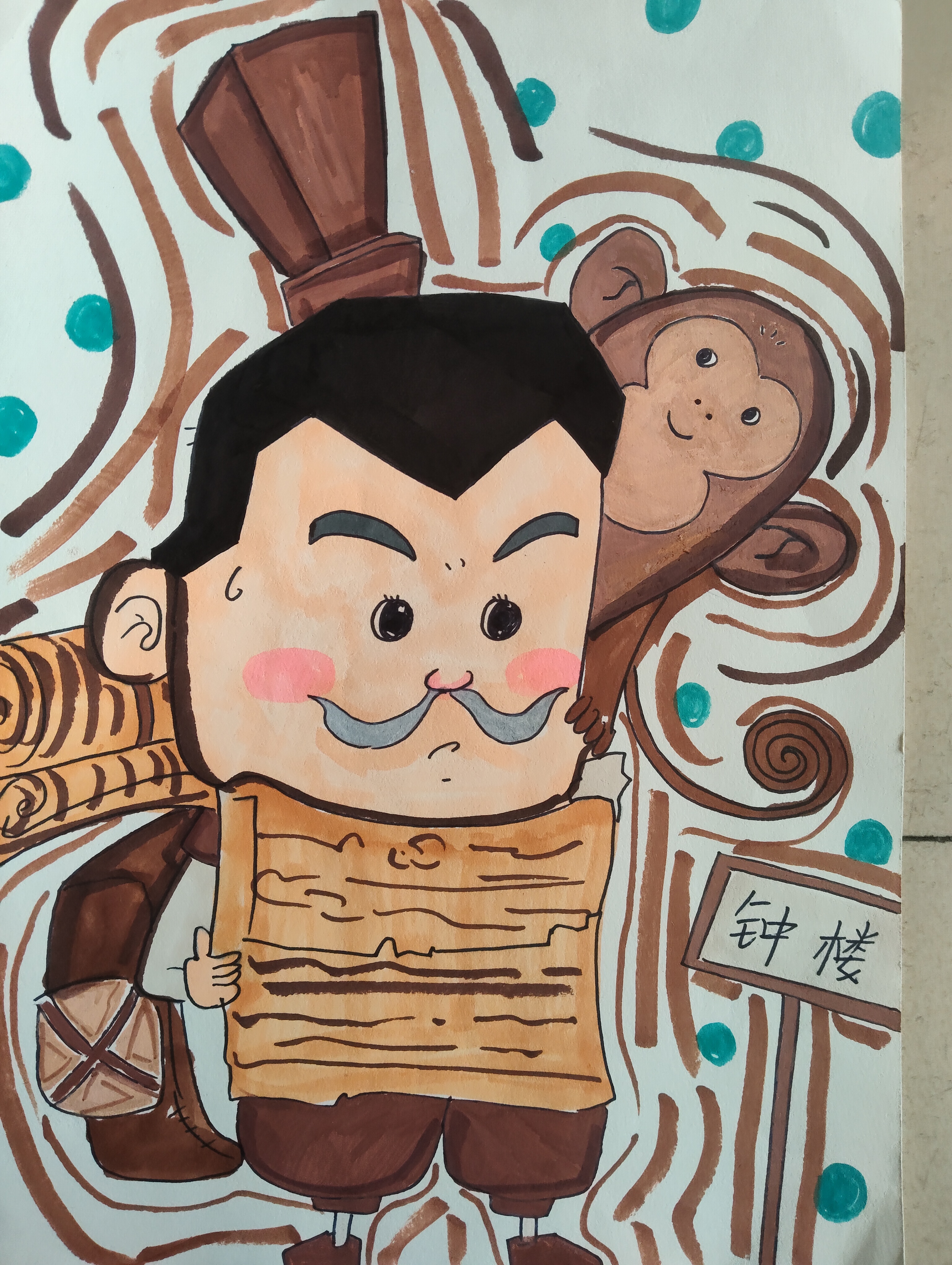 这是一幅卡通风格的手绘作品,画面核心是一个古代装扮的人物: 他梳着高髻发型,留着小胡子,脸上带着有点无奈的表情,脸颊还有腮红,显得很可爱;身上背着卷轴、挎着行囊,手里还捧着一卷竹简,装扮像是古代的文人或信使;身后藏着一只笑眯眯的小猴子,增添了活泼感;画面右侧有个写着"钟楼"的牌子,背景是棕色调的曲线和绿点装饰,整体风格童趣又生动。