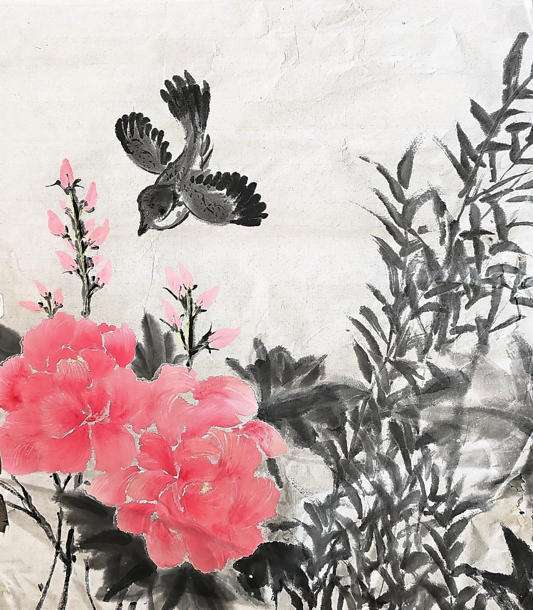 这幅水墨画以空灵留白与墨色交织,勾勒出飞鸟与花卉共生的自然画卷,恰是生态保护的无声宣言。画面中飞鸟展翅、花枝摇曳,展现了未经雕琢的野趣生机,隐喻着地方生态系统的脆弱与珍贵。墨分五色的层次与一抹亮色相映,提醒我们:自然需要留白,生命需要空间。在观光旅游日益发展的今天,这样的画面尤显珍贵——它呼吁我们在开发中保留原始生态,让每一处山水都能成为鸟雀长栖、花草自在的永恒家园。