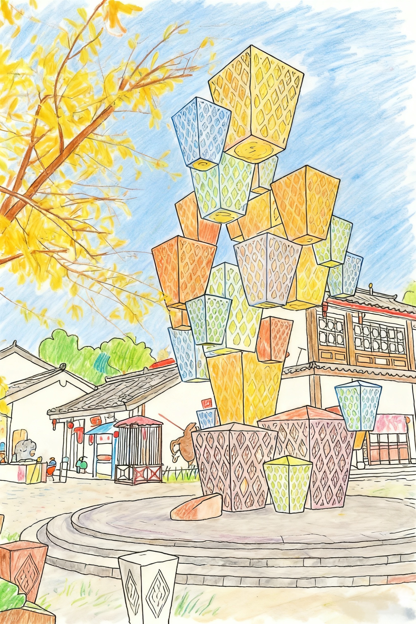 这幅画以传统灯笼为核心元素,用错落堆叠的现代形态,打破灯笼的固有印象:暖黄、橙粉的色调揉入秋日银杏的金黄,既保留中式灯笼的纹理质感,又以几何堆叠的动感,让传统符号生长出当代艺术的轻盈。 背景里的古建街巷、市集一角,是烟火气的锚点——灯笼不再是静态装饰,而是连接传统与当下的纽带,在秋日晴空下,把文化记忆拆解重组,落成一场“老韵新声”的轻盈对话。