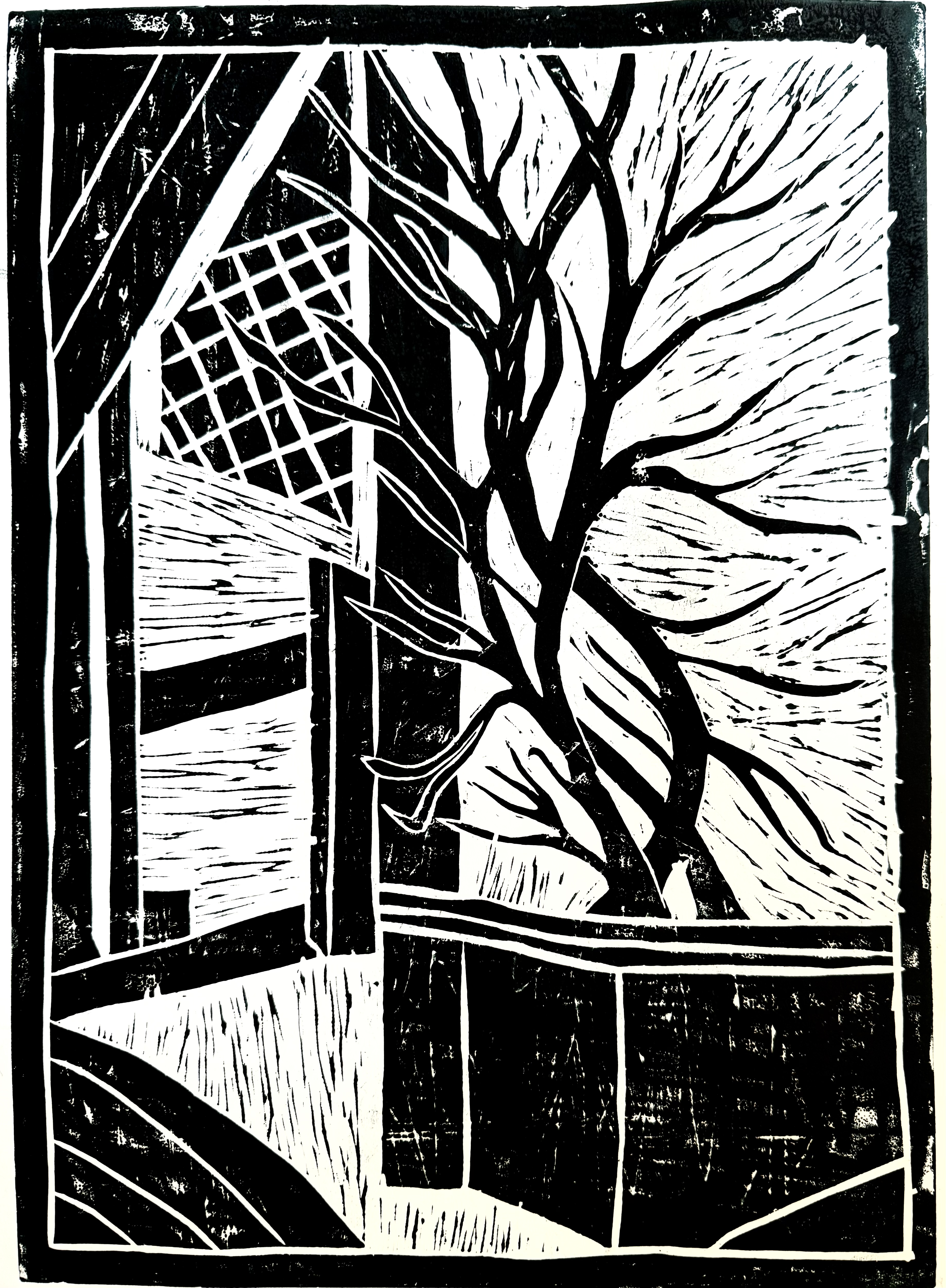 我用版画的黑白刻线,把这株三角梅藤变成了生态里的"小信使"。窗格的几何纹路是城市里的人工边界,而藤枝的交错线条,是自然在建筑缝隙里生长的倔强。那些舒展的枝桠,藏着我对"让植物和城市共生"的期盼:每一株在墙角、窗边扎根的藤蔓,都是生态里的"小补丁",它们让钢筋水泥的缝隙里有了呼吸,也让我们能在日常里摸到自然的温度。这幅画没有用色彩,却让藤枝的生机从刻线里漫出来,像在轻声说"给自然留一道窗"。