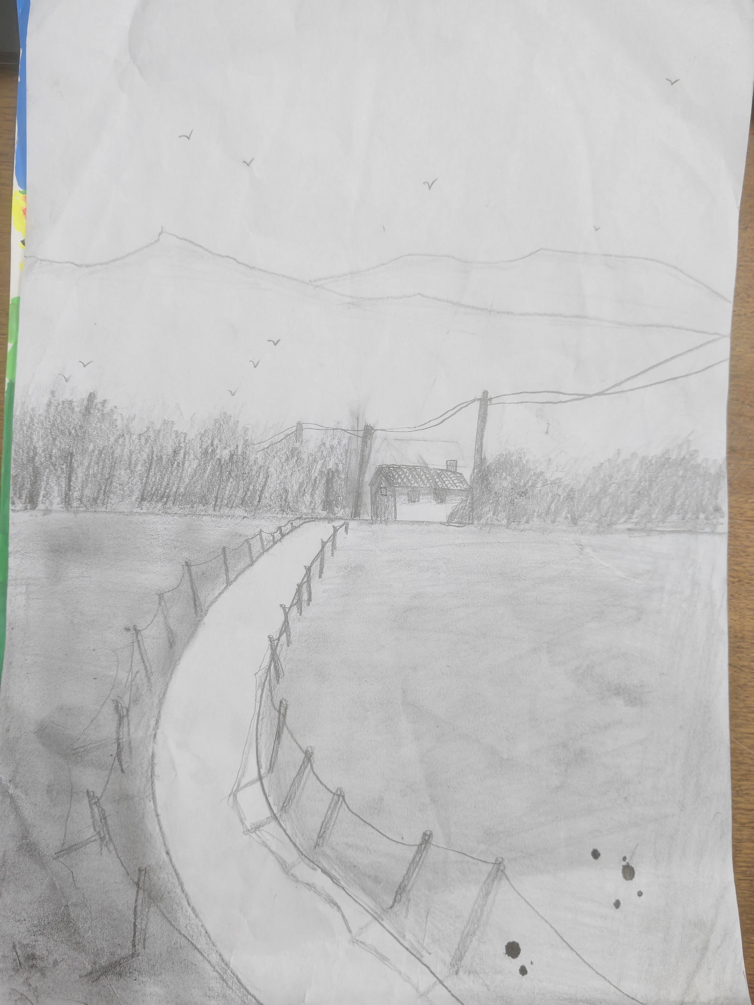 铅笔的灰度在纸上铺展,勾勒出一方宁静的乡野,这就是我的家乡。蜿蜒的小路像条银带,木栅栏沿着它曲折延伸,似在指引着去往远方的方向。路尽头的小屋,灰瓦白墙,在电线杆与电线的映衬下,透着质朴的烟火气。 远处的树林朦胧一片,山峦在天际线晕开淡影,几只飞鸟在灰白的天空里划出灵动的弧线。这简单的黑白灰,把乡野的静谧与悠远,都藏在了线条与明暗的交织中,如一首未写完的田园诗,余韵悠长。