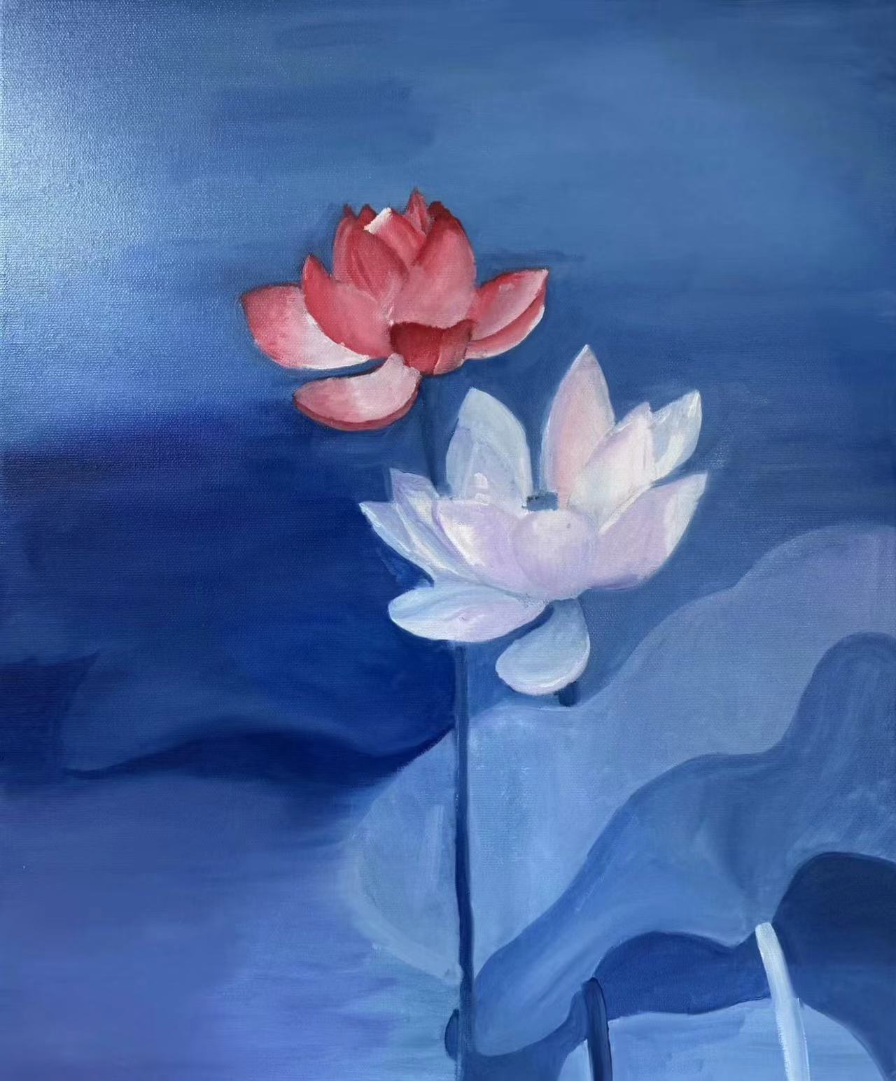 大家好!这是我画的《蓝境双荷・清涟绘》,画面里红粉、白紫两朵荷花浸在蓝调背景里,像裹了层安静的雾。荷花总给人干净舒展的感觉,我特意用偏冷的底色衬着,让花瓣的柔色更显眼。平时看荷塘里的荷花,风一吹晃悠悠的,特治愈。咱们要是见着荷塘,可别摘花折叶,让这些花儿能安安稳稳开着。你们觉得这蓝底衬荷花的色调,是不是挺有氛围感的?