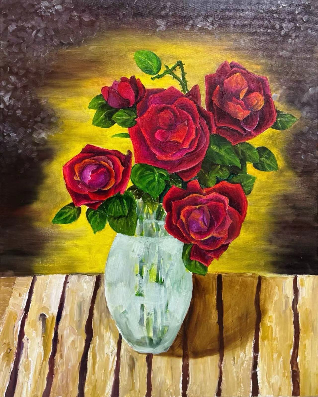 大家好!这是我画的《暖光瓶中绛玫簇》,透明花瓶里插着几支深红玫瑰,暖黄色背景衬得花瓣更浓郁鲜亮。玫瑰常被当作浪漫的象征,这抹热烈的红在柔和光线里,既有张力又透着温柔。生活里常见的玫瑰,不管是装饰还是送礼都很讨喜,但要注意它的花刺哦。咱们平时遇到玫瑰,别随意折损,让这些漂亮的花能多盛放一阵。你们觉得这暖光配红玫瑰的氛围,是不是很有温馨感?