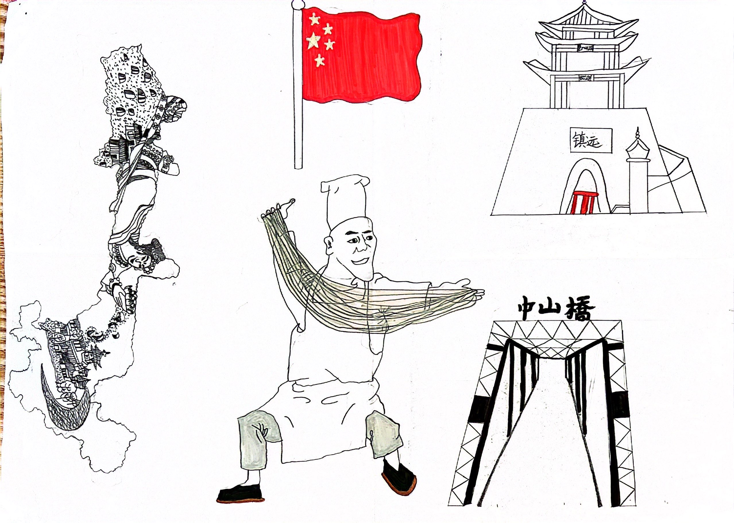 这幅画以“地域文化与家国联结”为核心:左侧将甘肃地形轮廓揉进敦煌飞天、丝路建筑,锚定地域文化根脉;中间拉面师傅的动态是生活烟火,红旗则牵起个体与家国的情感纽带;右侧镇远楼、中山桥是地域地标,也是时代发展的印记。 我想用拼贴式的组合,把“文化符号+生活日常+家国标识”织在一起——既显甘肃的地域特质,也藏个体烟火与家国情怀的共生:每处文化符号、每个生活场景,都是家国图景里的鲜活碎片。