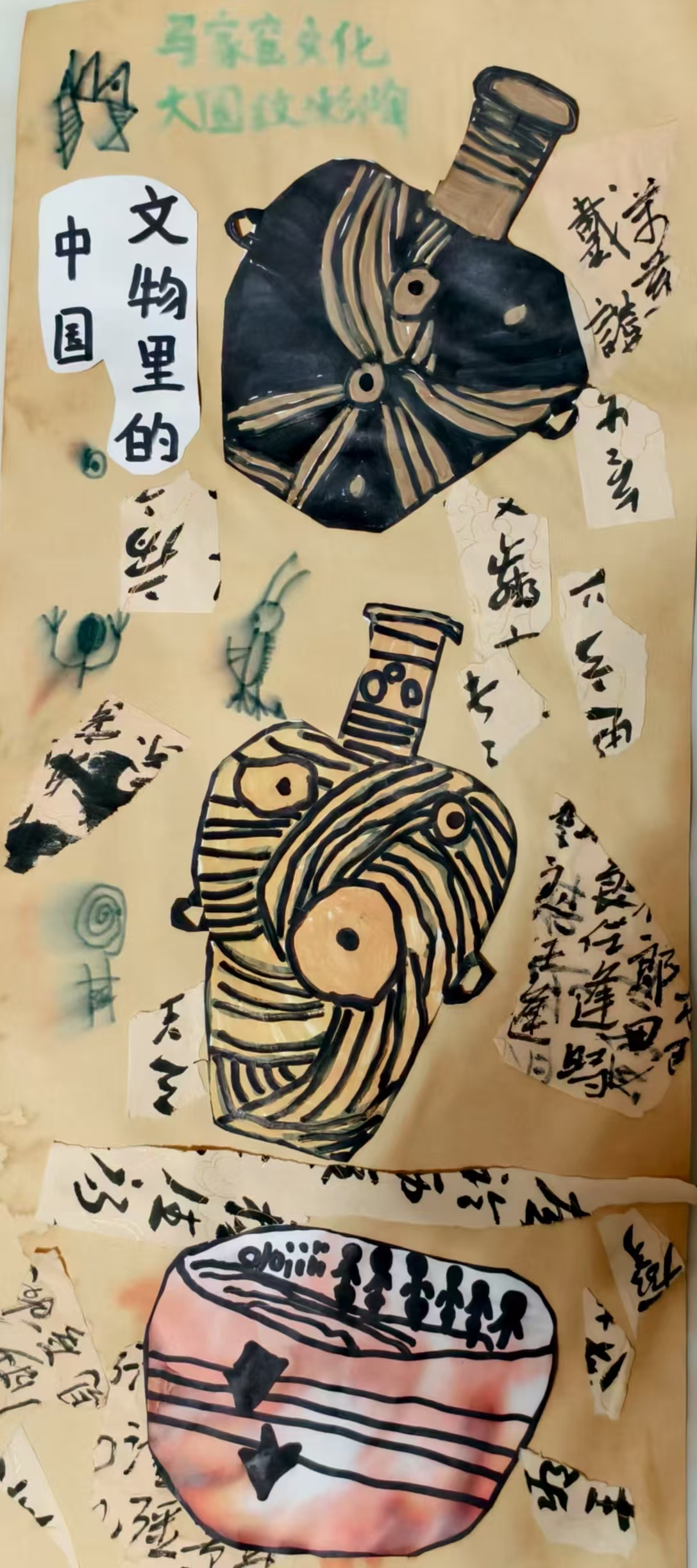 这幅画的创作,是想把 "文物上的远古纹路" 变成能触摸的笔墨:泛黄的底色像老纸卷,把马家窑文化的彩陶从博物馆 "搬" 到画里 —— 那些黑褐的纹样不是冰冷的线条,是古人用泥土和火写下的 "日记"。 旁边的手写文字,是想让今天的笔,和几千年前的纹路说说话:彩陶上的鱼纹、水纹,都藏着先民对自然的敬畏,我用晕开的墨色和稚拙的线条,让这些 "沉默的文物",在画里发出能被听见的、属于远古的轻响。