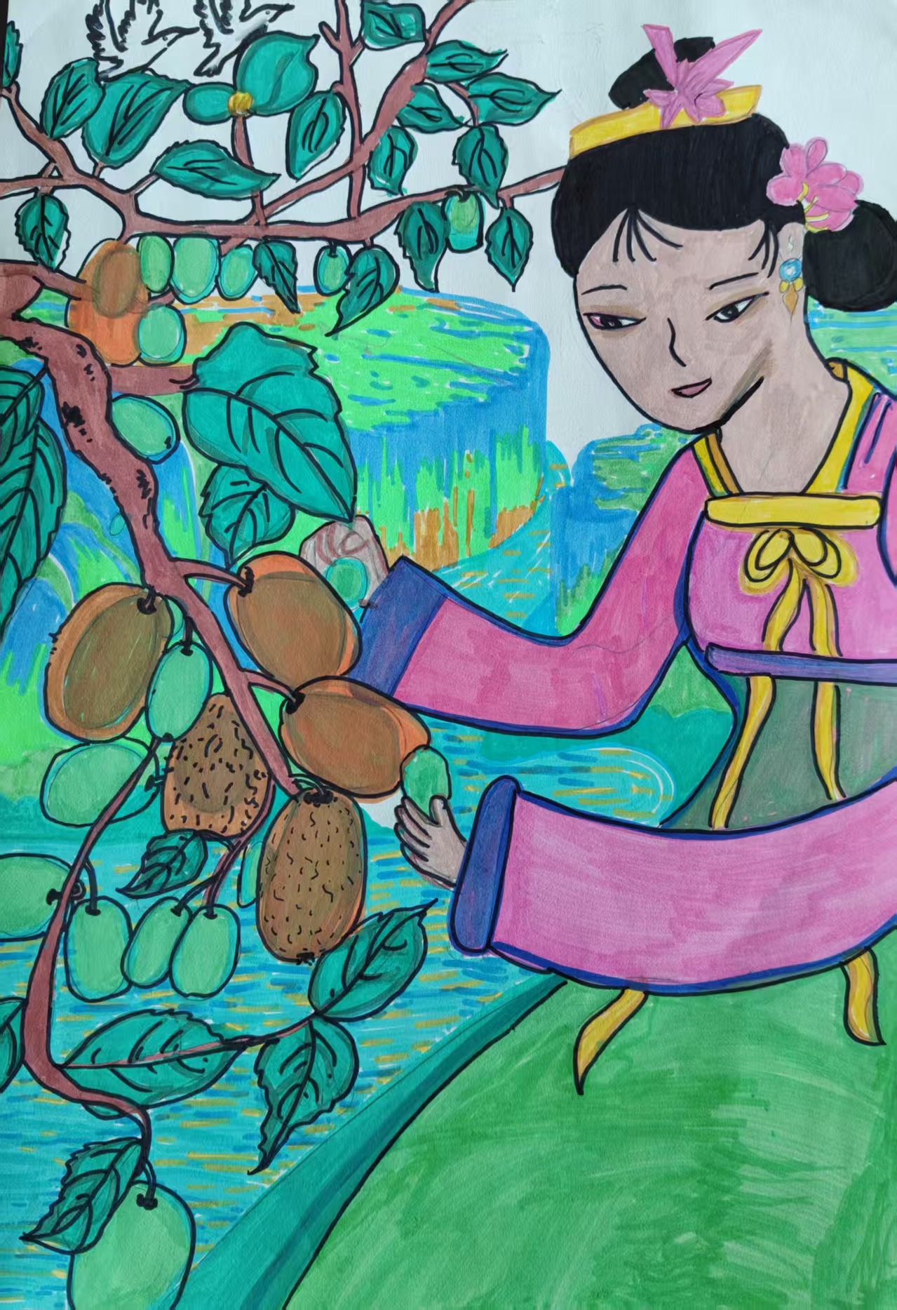 这幅作品以古风装扮的女子采摘猕猴桃为核心画面,色彩明快且富有层次感:翠绿枝叶、饱满的猕猴桃果实勾勒出丰收的自然景致,古典服饰的女子温婉的采摘动作,融合了传统人文与乡土生机。整体用鲜艳的色彩、灵动的线条,将东方古典美学与自然风物相融,传递出丰收的喜悦与田园生活的美好