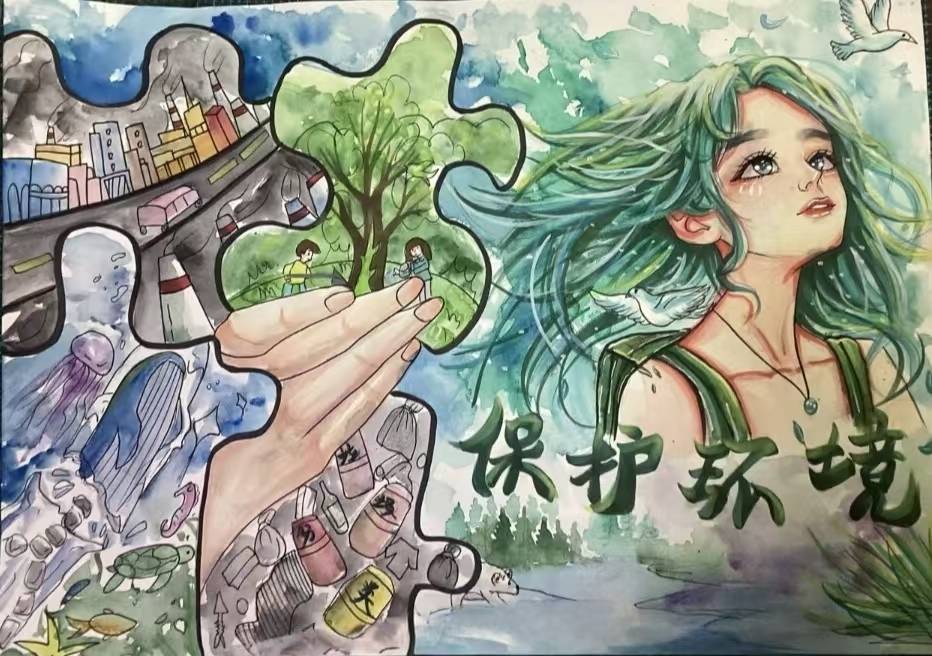 画作并非一味地渲染绝望。拼图右侧那位头发翠绿、眼神坚毅的女子以及她肩头的白鸽,是希望、新生与和平的象征。她们的存在表明,只要我们做出正确的“抉择”,希望就在身边,行动的力量就来自于我们每一个人。通过“拼图”这一精妙的比喻,以极具冲击力的视觉对比,呈现人类在环境保护问题上所面临的紧迫抉择。它警示我们,地球的完整与美好正悬于一线,而决定其最终面貌的,正是我们每个人当下的意识与行动。这幅画不仅是对现状的反思,更是一声振聋发聩的行动号角,呼吁人们亲手将“绿色”的希望拼回属于我们所有人的未来。