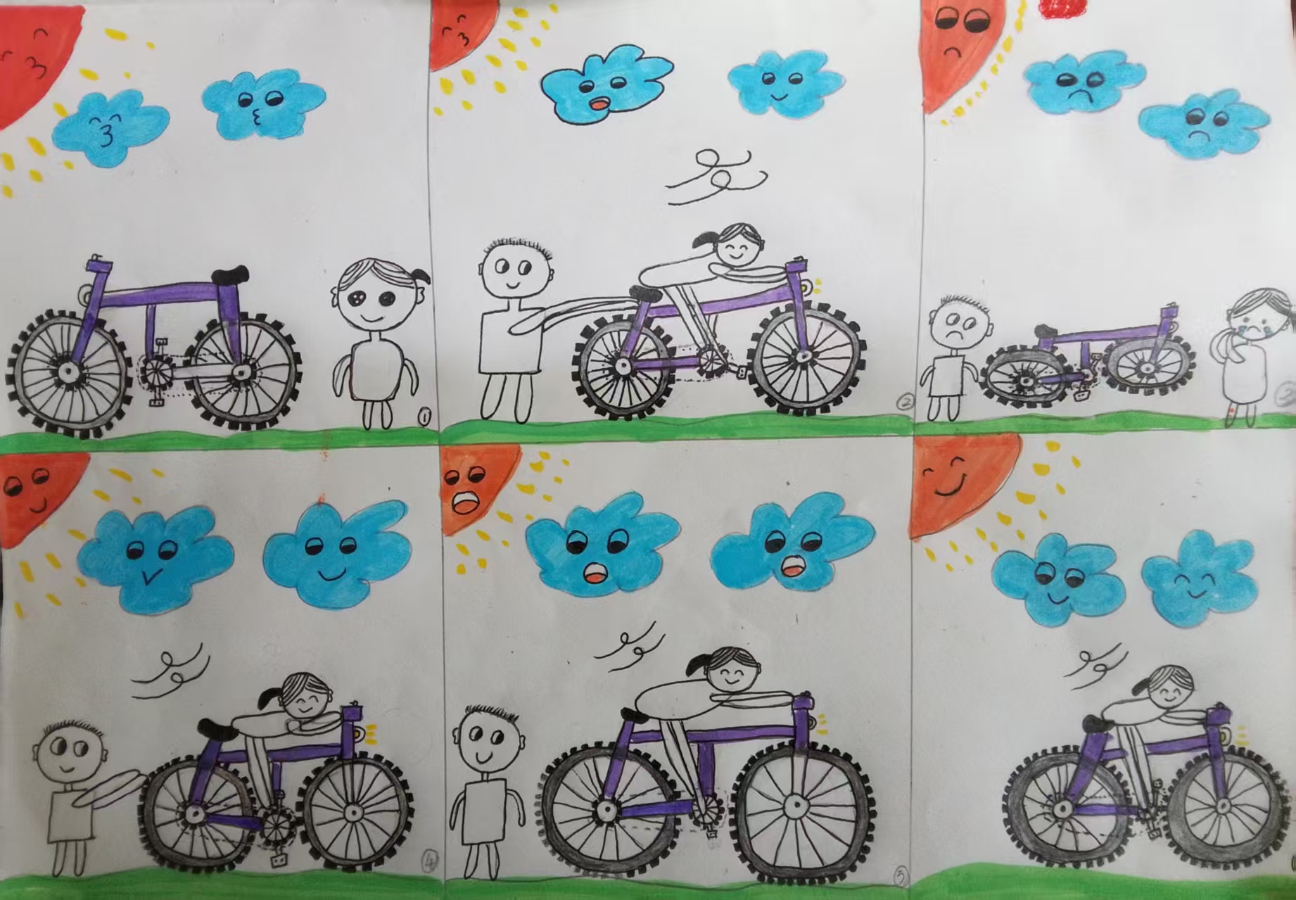 呀!突然,哐当一声,我连同自行车一起摔倒了。那时我的腿已经开始流血了,痛得我直流眼泪。我没有放弃,继续开始学了。爸爸慢慢放手,呀!我学会骑自行车啦。