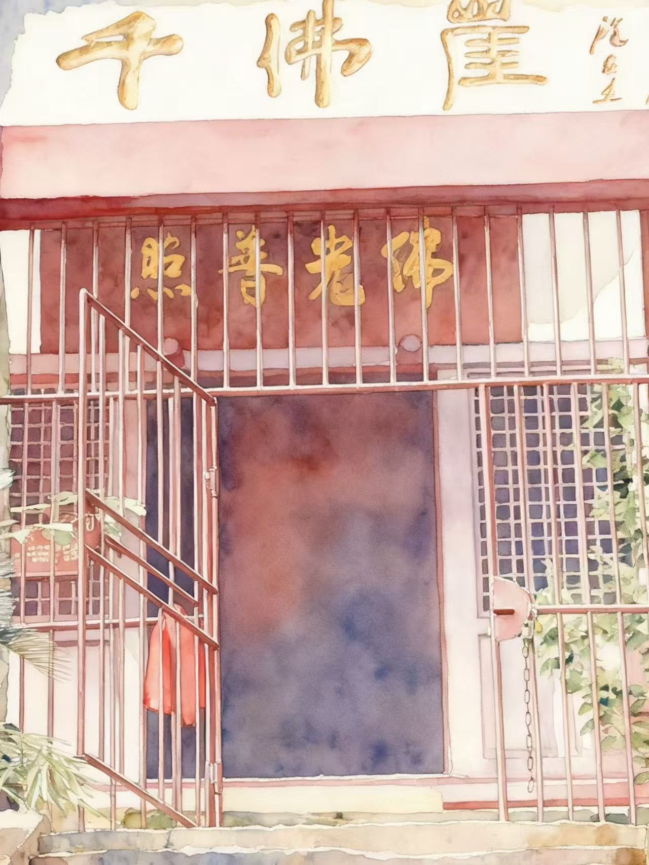 “光影”更核心的所指,是门楣上金光闪耀的“佛光普照”四字。这“光”并非自然之光,而是智慧与慈悲的象征之光。它穿透画面的中心,照亮“千佛崖”,意味着佛法的启迪能够照亮心灵,驱散迷雾。旨在通过视觉元素与文字符号的巧妙结合,创造一个既真实可感又超脱物外的意境。台阶和点缀的绿植是尘世的痕迹,而越向门内深入,越是走向光影与精神的澄明之地。