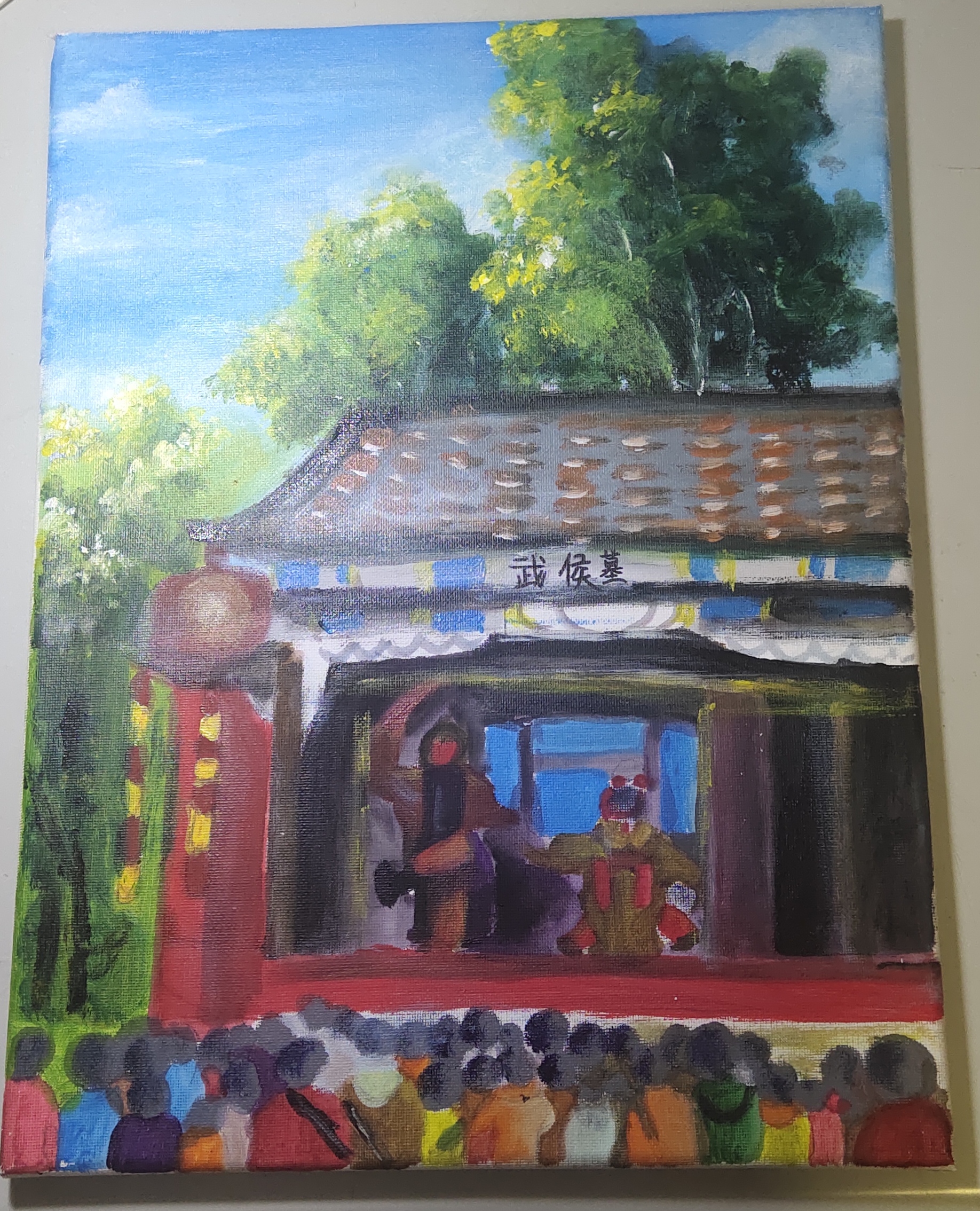 本作品以勉县武侯墓为创作核心,再加上舞台上的戏曲演员,定格祠中红墙古柏、天光映景的瞬间。取地方特色文化地标为基,将武侯"鞠躬尽瘁"的精神内核与祠宇千年静穆气质相融,以鲜亮色彩衬历史厚重,用窗景的框定传递对先贤的追怀。既展现地域风貌,也让传统人文精神在笔墨中自然流露。