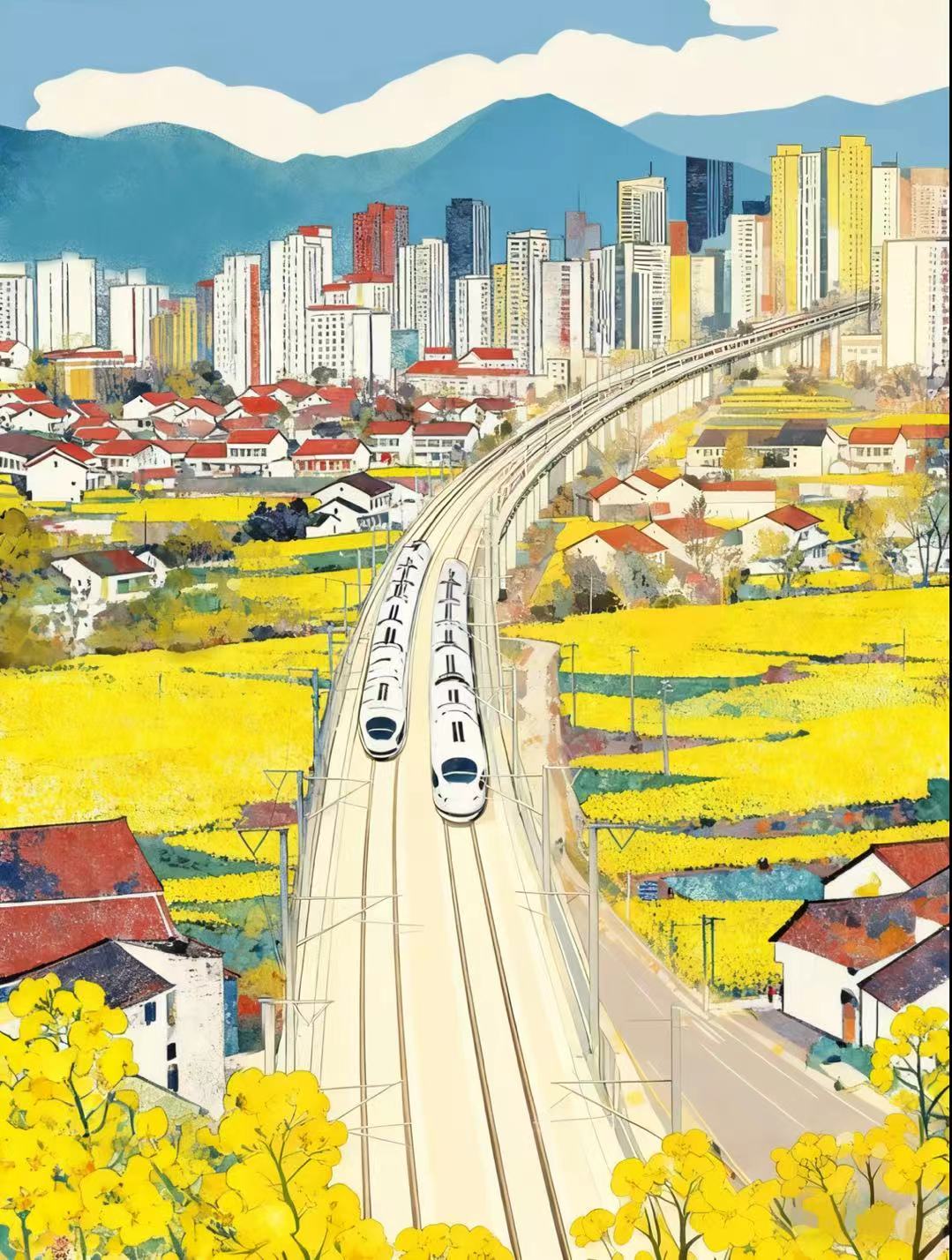 这幅画的创作理念,是以春日漫野的油菜花为底色,织就城乡共生的鲜活图景:明黄的花田是乡野的烟火肌理,而飞驰的高铁则是现代文明的动脉,二者在画面里自然缠绕——既保留着村落白墙红瓦的烟火温度,也生长着都市楼宇的向上张力。