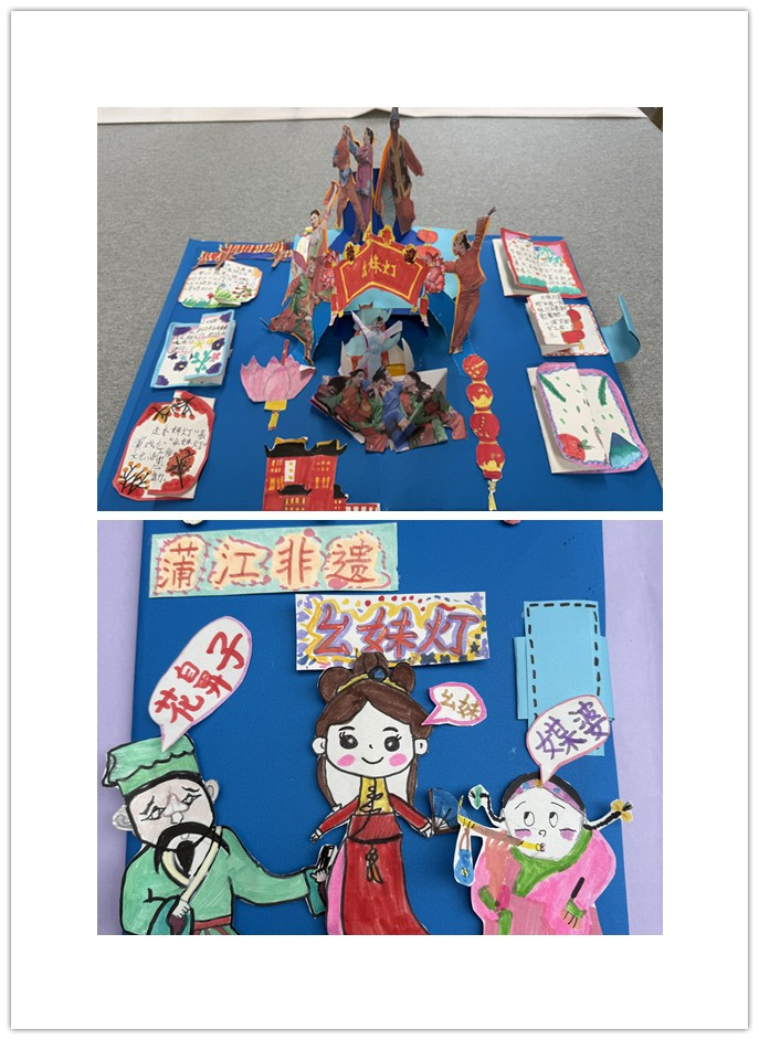 这是立体非遗主题创作,聚焦“幺妹灯”民俗:层叠剪纸还原了表演者的服饰与姿态,红灯笼、中式建筑元素衬出年节氛围,旁附文字介绍非遗背景。立体造型让表演场景鲜活起来,把传统民俗的热闹与文化传承的细节,都凝在这方蓝色底板上。呈现蒲江非遗“幺妹灯”:红装幺妹、花鼻子、媒婆的形象鲜活可爱,“蒲江非遗”“幺妹灯”字样点明主题,红灯笼点缀出民俗氛围。简洁的人物造型与对话气泡,让非遗民俗的角色特点与趣味,变得直观又生动。