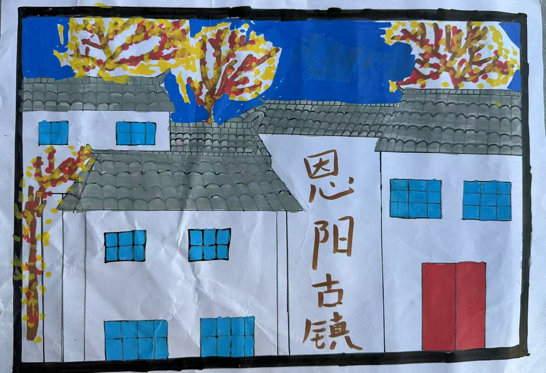 它绘的是巴中恩阳古镇:青瓦白墙是川东北民居特色,红黄树叶晕染出巴中秋色。恩阳古镇是"川陕革命根据地"旧貌保存最完整的古镇之一,石板街连起明清院落,这幅画以暖秋衬古居,藏着恩阳"千年水运码头"的烟火气,也凝着巴山民居的温婉韵致。