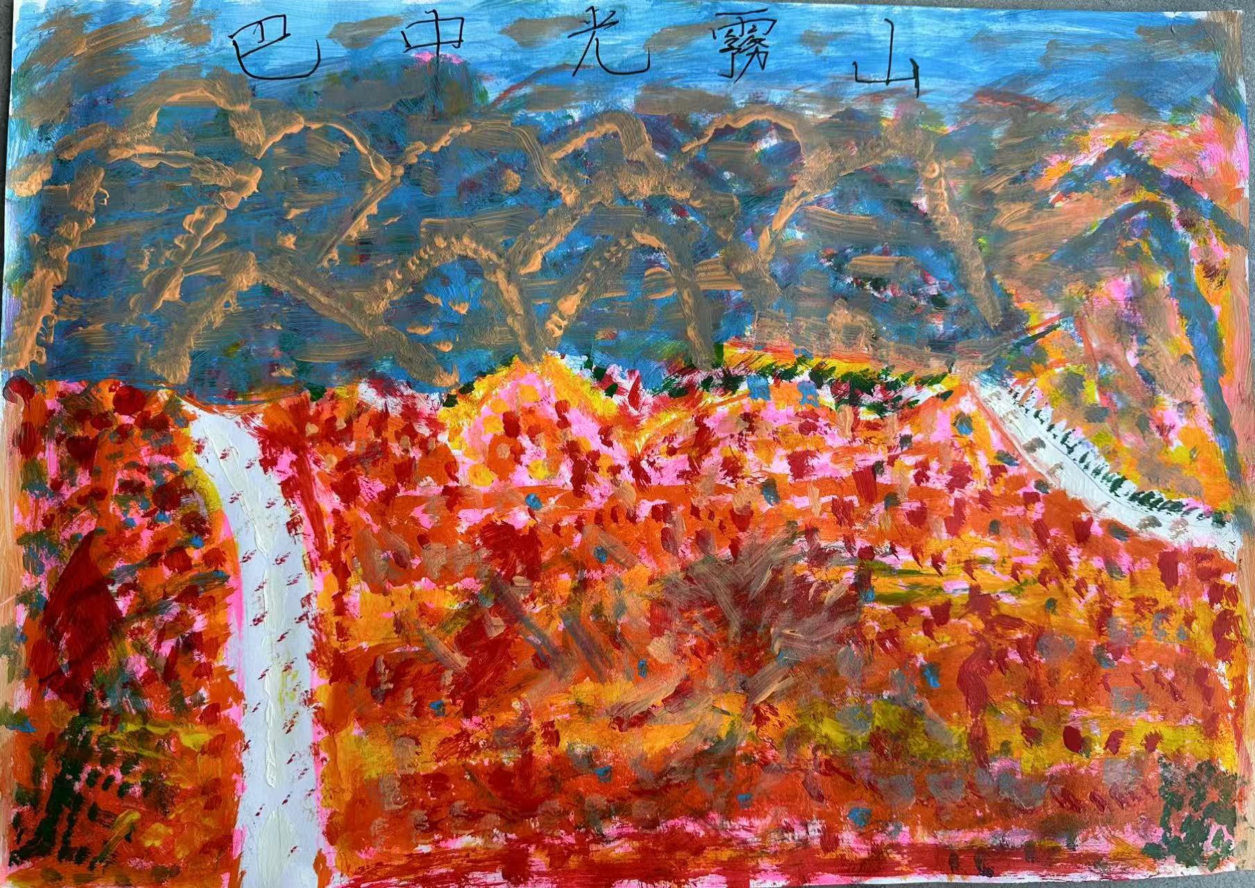 它绘的是巴中光雾山秋景:浓墨重彩的红橙黄,是光雾山"亚洲最长红地毯"的缩影——这里是中国红叶之乡,水青冈林在深秋晕染出斑斓,画中蜿蜒小径藏着米仓山的喀斯特秘境。光雾山既是世界地质公园,也是巴中山水名片,这幅画将其秋日盛景揉作热烈色块,尽显巴山生态之美。
