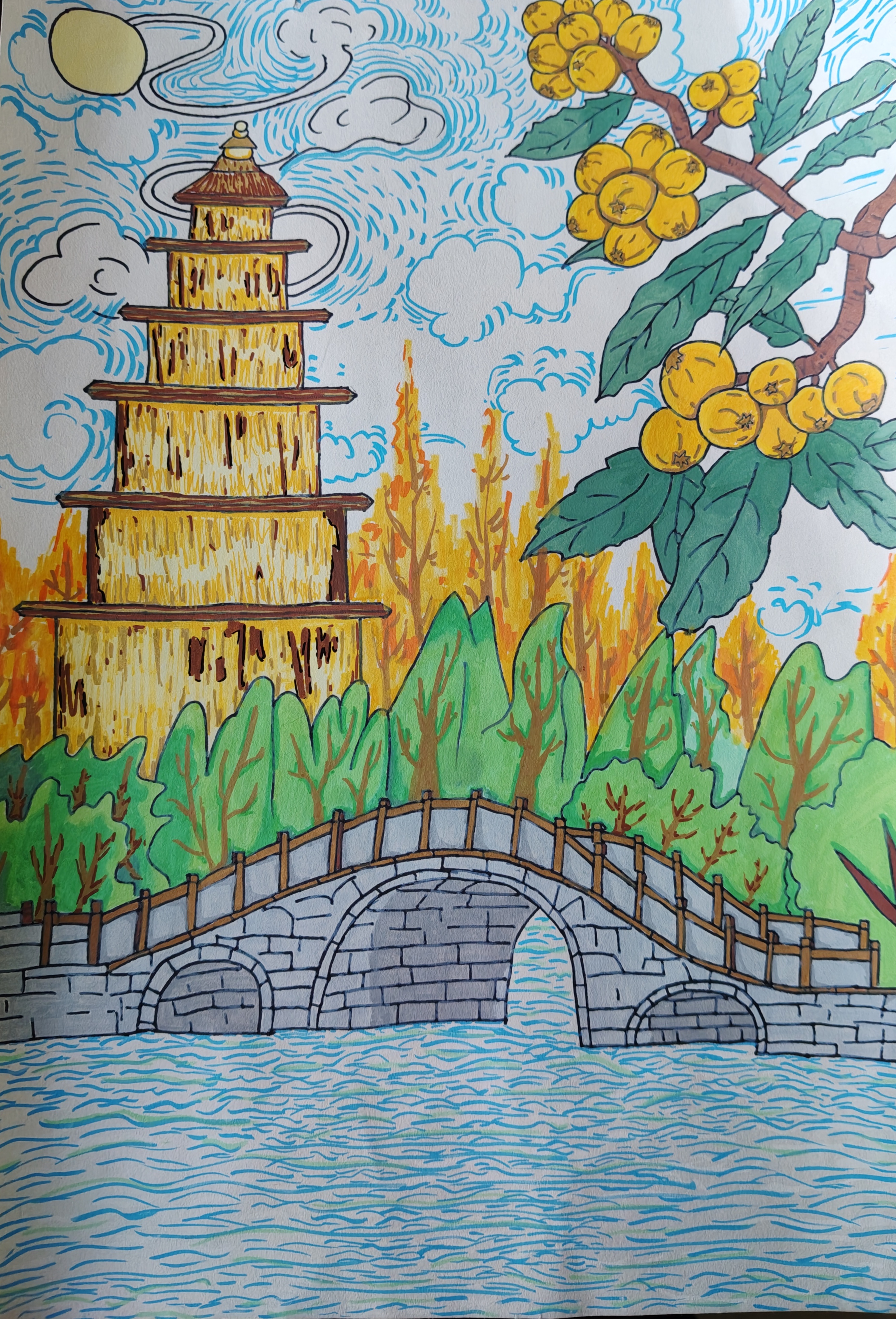 作品简介 这幅作品以古塔、石拱桥、枇杷树为核心元素,勾勒出江南秋日的诗意景致。暖黄色的古塔矗立,石拱桥横跨波光粼粼的水面,枝头饱满的枇杷果实添缀生机,蓝白交织的云纹与水纹线条,让画面兼具灵动与韵律。整体以明快的色彩、层次分明的构图,融合建筑古韵与自然风物,传递出江南秋景的温婉与美好