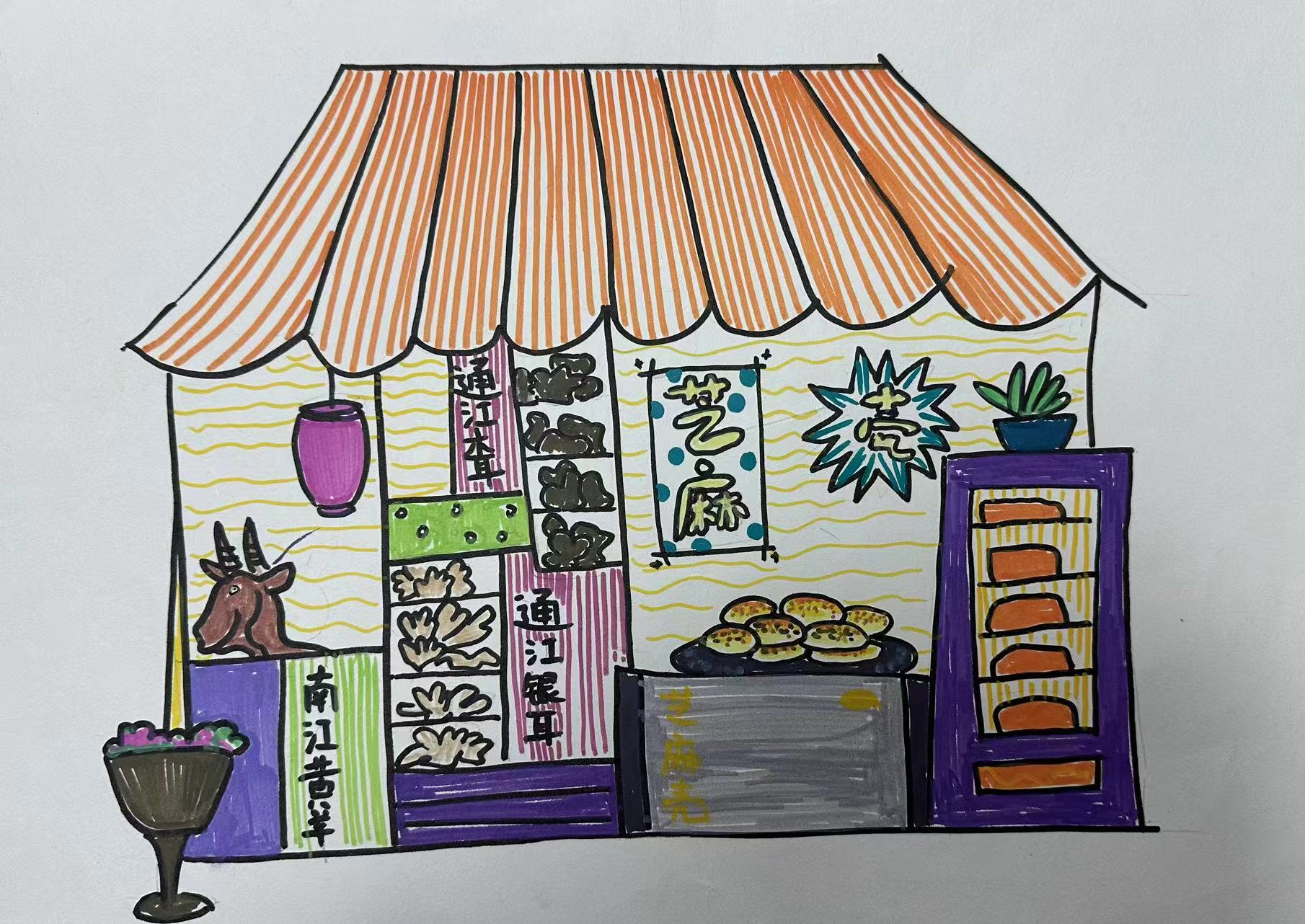 它绘的是巴中特色风物小店:通江银耳、南江黄羊、芝麻壳(巴中传统小吃)齐聚,是巴中山珍与美食的缩影。巴中物产丰饶,通江银耳为"菌中明珠",南江黄羊是国家地理标志产品,芝麻壳甜香酥脆,这幅画以市井小店裹满巴地烟火,尽显川东北物产的质朴与丰美。