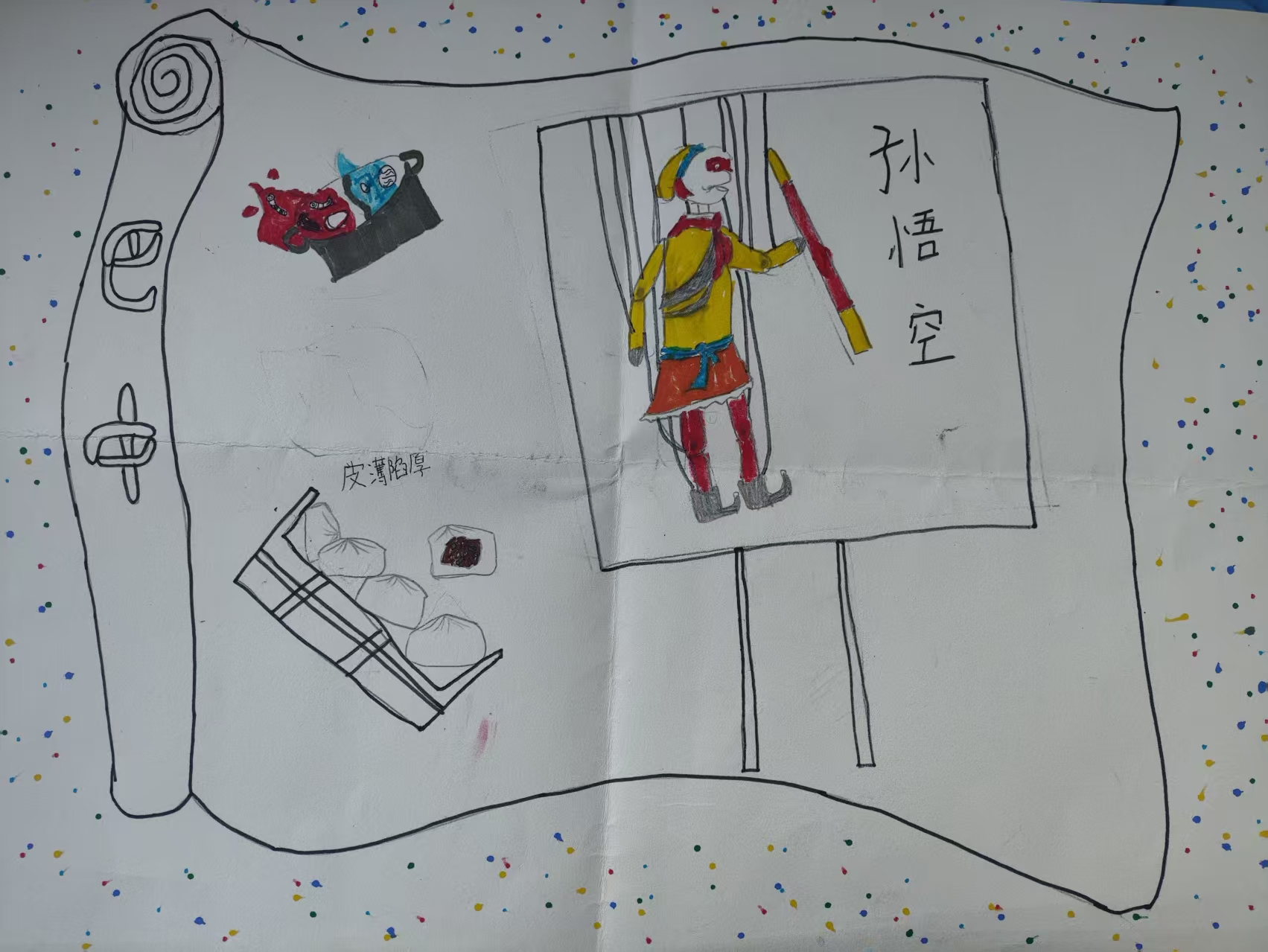 地域符号锚定:画面左侧 "巴中" 卷轴形制 +"皮薄馅厚" 的包子元素,对应巴中特色美食,直接建立地域饮食关联; 文化意象融合:将经典形象 "孙悟空" 与巴中元素结合,以手绘形象传递文化趣味性,同时暗合四川(巴中所属地域)与《西游记》文化传播的关联; 生活气息传递:美食与文化形象的搭配,既展现巴中饮食特色,也以轻松的创作形式,让地方特色在日常风物与文化符号的交织中更具感染力,体现对本土风味与文化趣味的融合表达。