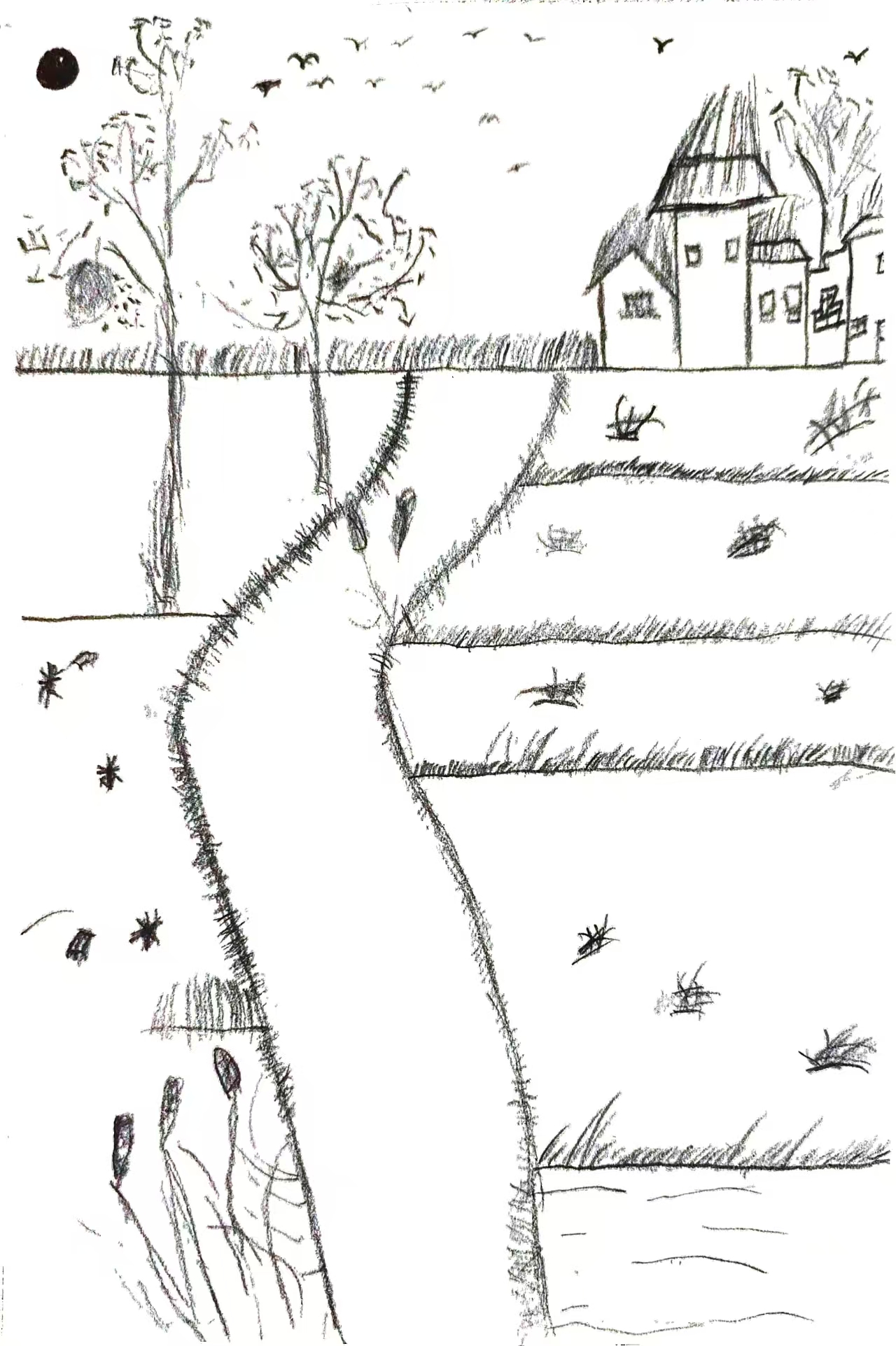 用简淡的线条勾勒乡野轮廓——疏枝、矮屋、蜿蜒小径,还有归巢的飞鸟,都是记忆里村落的日常模样。我想借速写的松弛笔触,还原晚风里乡村的静谧质感:没有浓烈色彩,只靠线条的疏密铺陈空旷与悠然,让画面载着松弛的烟火气,唤起对乡野慢时光的轻缓念想。