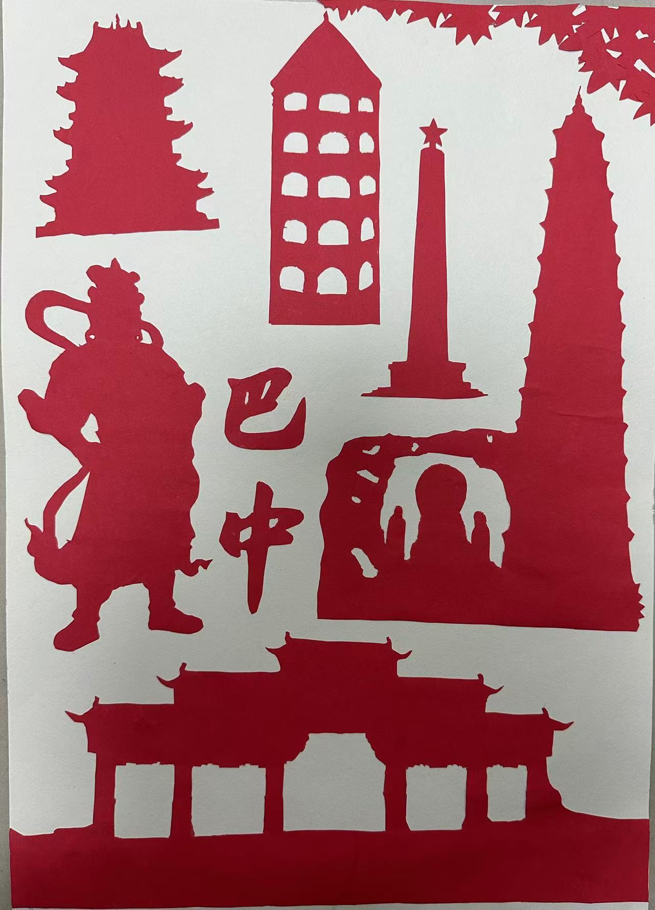 它以剪纸红韵凝巴中底色:图中既有回风亭、红军纪念碑等红色地标,也藏南龛石窟造像、传统楼阁等巴中风物,更以关羽剪影衬川北民俗。巴中是红色圣地与文化名城,这幅剪纸以红为底,将其红色基因、历史遗存与地域风貌融于一体,是巴中"红魂裹古韵"的鲜活缩影。