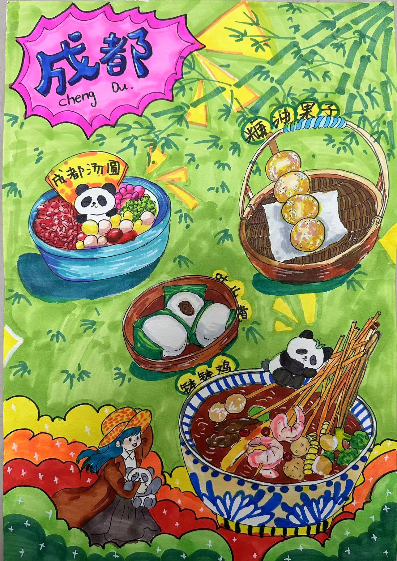它绘的是成都烟火味:熊猫元素衬着汤圆、糖油果子、叶儿粑等蓉城小吃,裹着红油串串的麻辣鲜香。作为四川省会,成都以"慢食闲味"闻名,这些小吃既藏着川味的麻辣底色,也裹着市井里的甜糯烟火,画中青绿竹影更衬出"天府之国"的闲适,是成都"食味裹闲趣"的生动缩影。