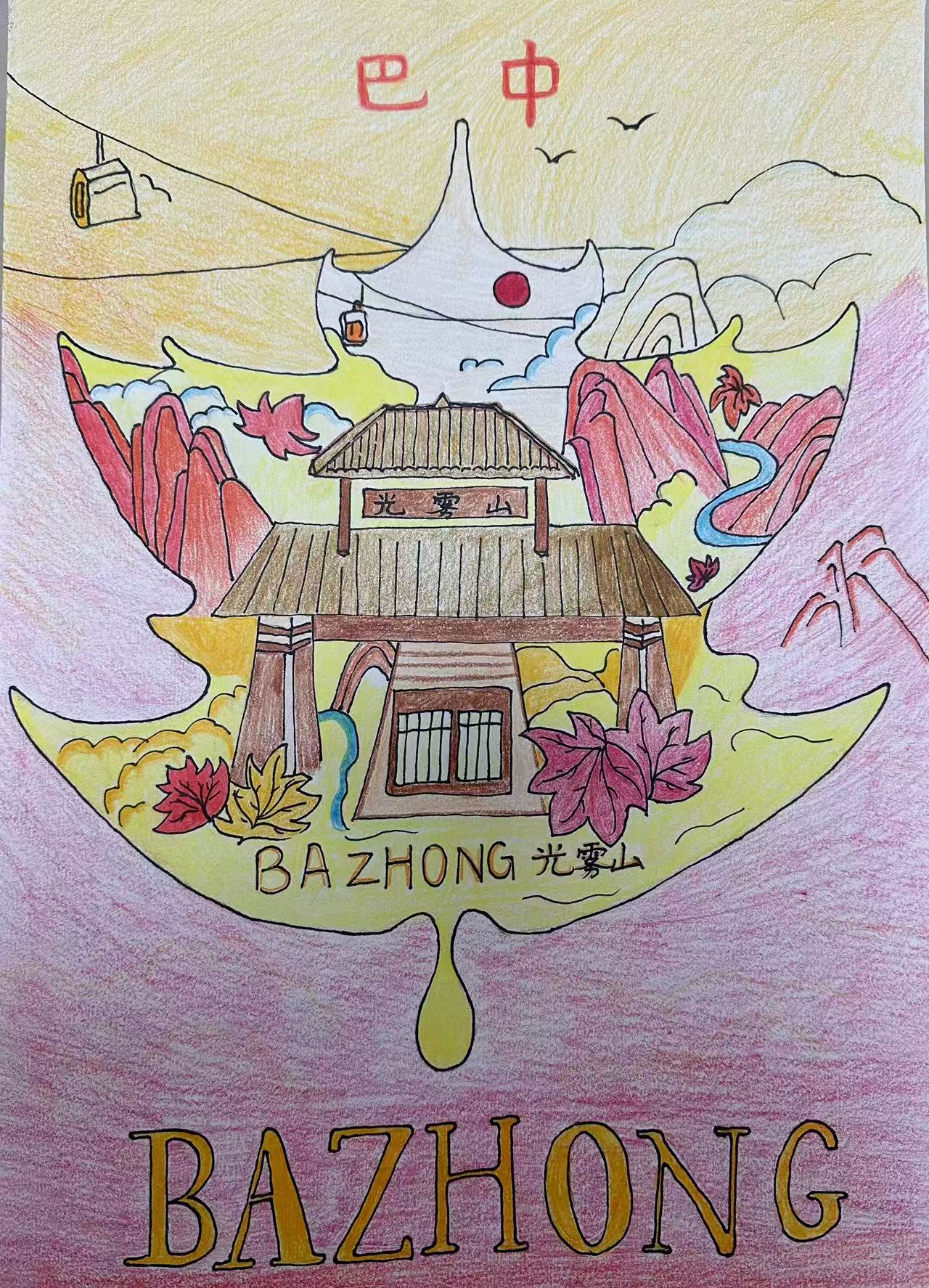 它以红叶为形裹巴中光雾山盛景:画里的彩林、亭台是光雾山秋日的缩影——作为巴中名片,光雾山是"亚洲最长红地毯",秋日水青冈林晕染出斑斓,缆车与亭台更衬出景区的灵秀。这幅画将光雾山融于红叶轮廓,既藏巴山生态之美,也显巴中"红叶之都"的独特韵味。