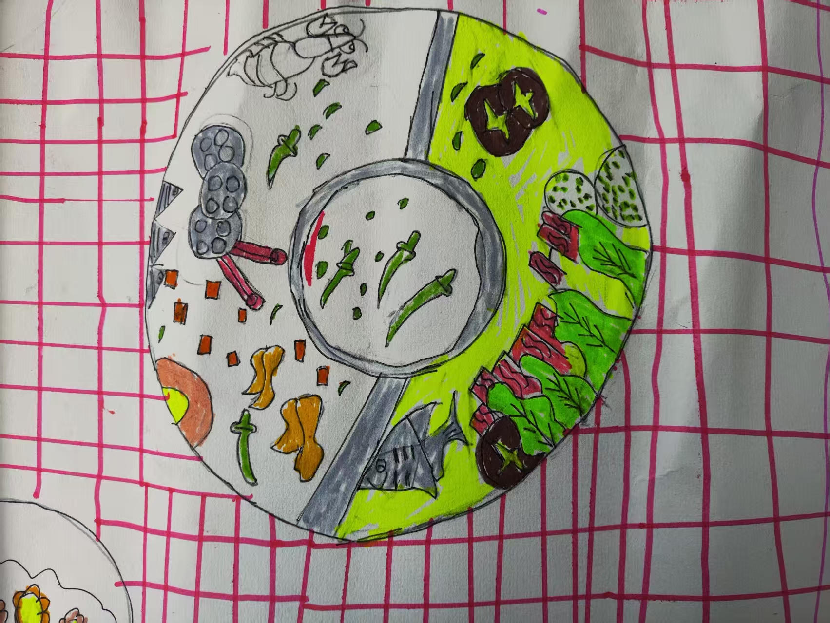 地域美食符号聚焦:以四川(含巴中)标志性美食 "火锅" 为核心载体,通过九宫格分块呈现不同食材(肉类、蔬菜、菌菇等),直接锚定川渝饮食特色; 视觉分区叙事:用色块与线条划分火锅区域,既还原火锅 "分格煮食" 的饮食形式,也让多样食材清晰呈现,强化 "丰富烟火气" 的视觉感受; 生活场景代入:以手绘 + 网格背景的形式,模拟餐桌用餐的日常氛围,让地域美食符号与生活场景结合,传递川渝饮食文化中 "围炉共食" 的生活底色。