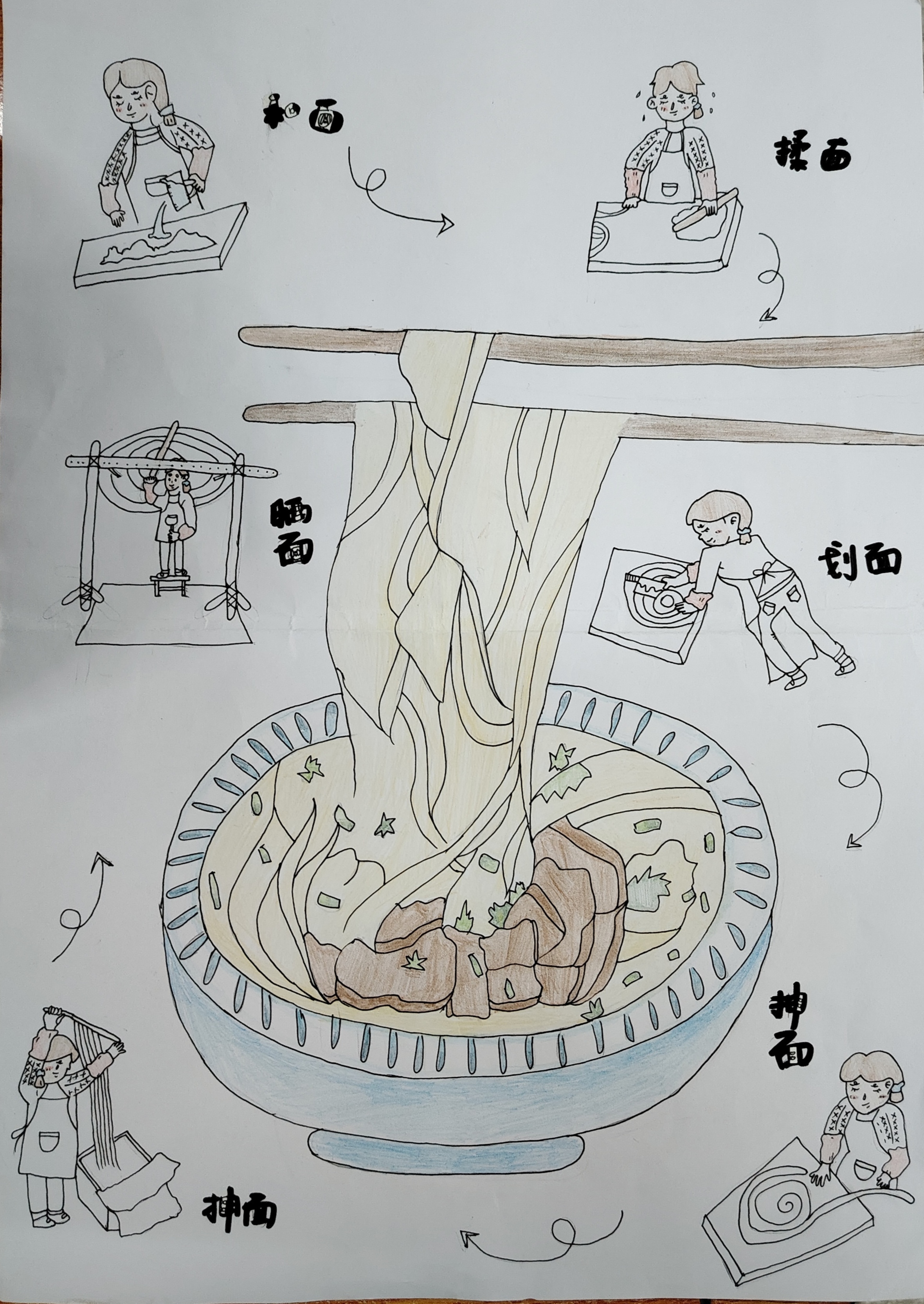 我以河南烩面的手工制作流程为核心,用童趣的手绘串联起“和面—揉面—晒面—划面—抻面”的完整工序:画面中心舒展的宽面如流动的纽带,将各步骤的人物动作(和面的专注、揉面的用力、晒面的巧思)自然衔接,最终汇入盛满骨汤与配料的大碗中。 我以线条的动感和场景的生活化,还原了烩面“手工抻制”的烟火气——每一步工序都是老手艺的传承,碗里的面既是舌尖美味,也是河南人“慢工出细活”的生活态度具象化。