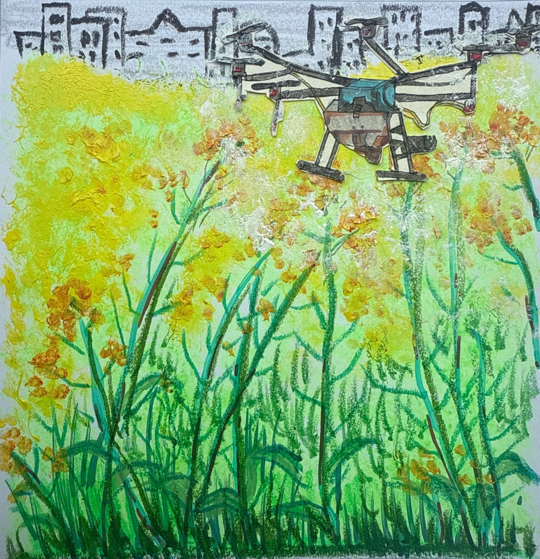 这是一幅科创的绘画作品,作品聚焦“科技助农”:浓墨重彩绘出金黄油菜花田,剪纸拼贴的无人机悬于花海上空,背景浅描城市轮廓。肌理感的色彩衬出田园生机,科技元素的加入,让传统农耕场景与现代智慧农业的碰撞,变得直观又生动。