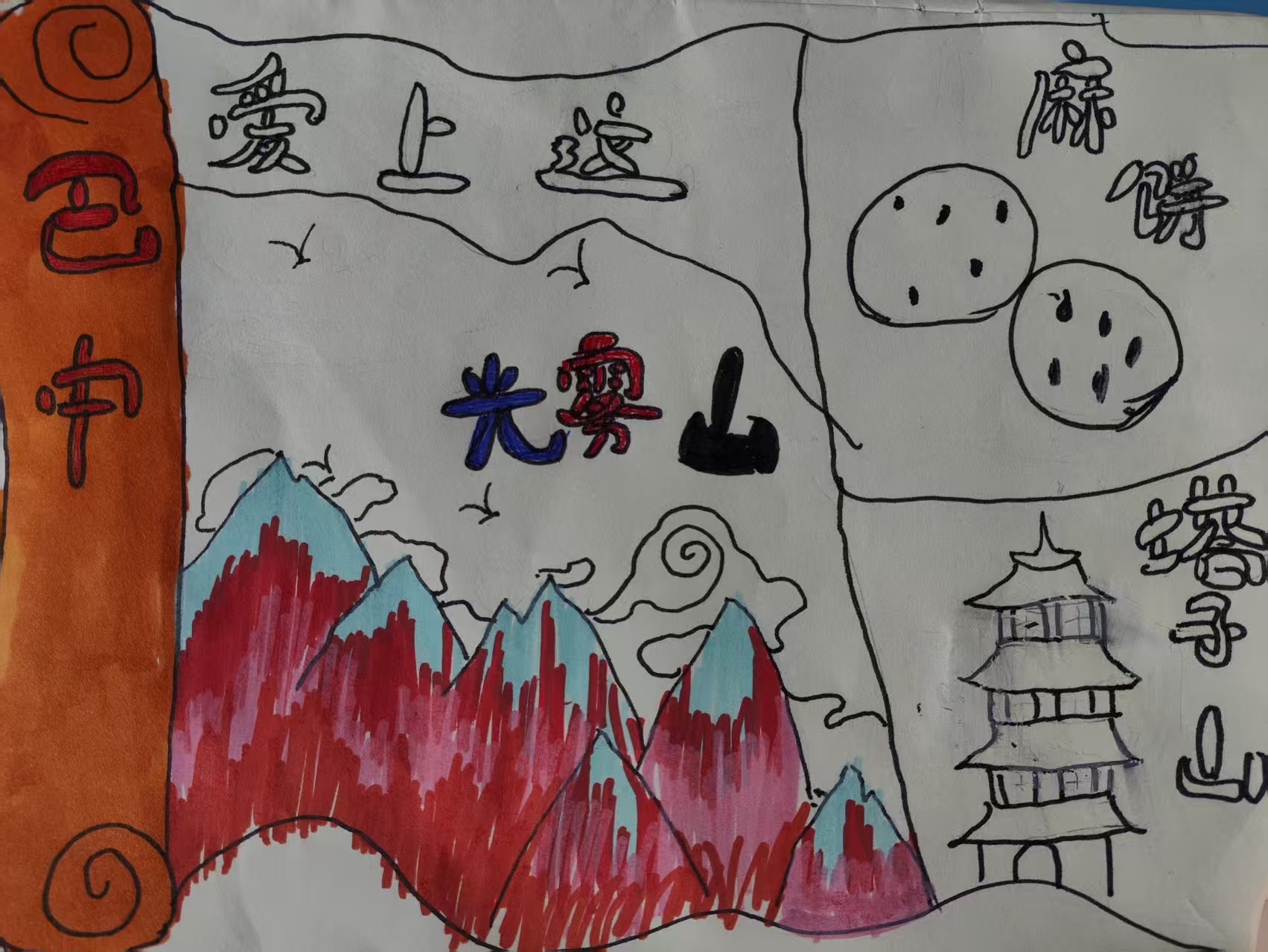 以 "卷轴" 为载体,整合 "自然景观 + 人文建筑 + 本土美食" 三类元素: 用 "巴中"光雾山" 锚定地域属性,以山水、塔楼构建巴中风物的视觉基底; 以 "麻饼" 呈现本土饮食特色,串联自然、人文与生活烟火; 借助手绘风格与分块布局,将 "生态、文化、美食" 融合为整体,既突出巴中 "山水 + 人文 + 食味" 的特色辨识度,也传递出 "爱上巴中" 的情感与地域特色的共生感。
