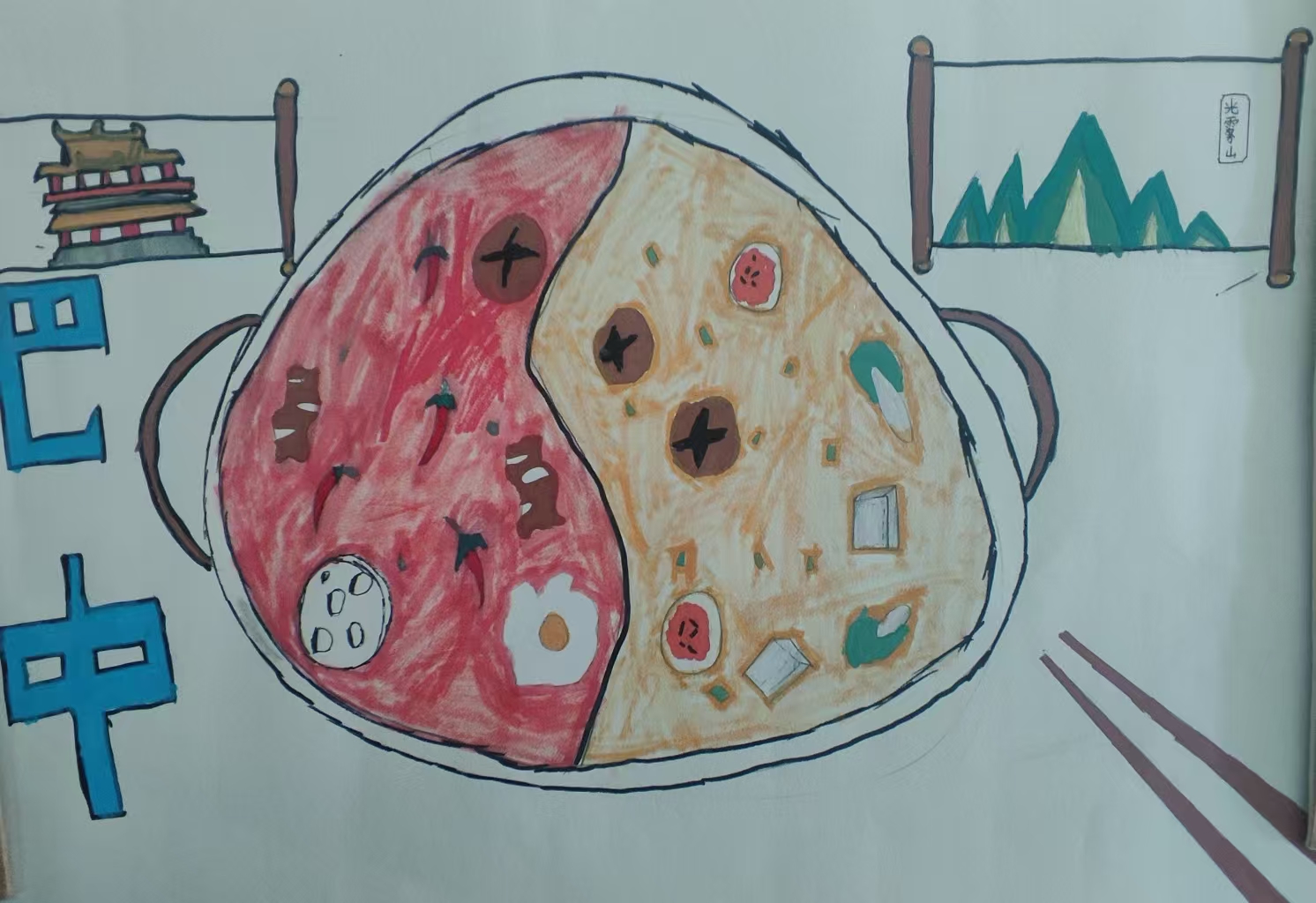 以 "鸳鸯火锅" 为核心载体,融合 "地域标识 + 人文建筑 + 自然风貌" 实现表达: 用 "巴中" 文字、飞霞阁建筑、光雾山意象构建巴中风物的视觉基底,明确本土属性; 以鸳鸯火锅为核心,通过红汤、清汤及食材呈现,聚焦本土饮食特色; 借助 "美食 + 风貌" 的并置形式,将巴中的自然、人文与生活烟火融合,既突出本土饮食的辨识度,也传递出 "山水之城、美食之地" 的地域特色共生感。