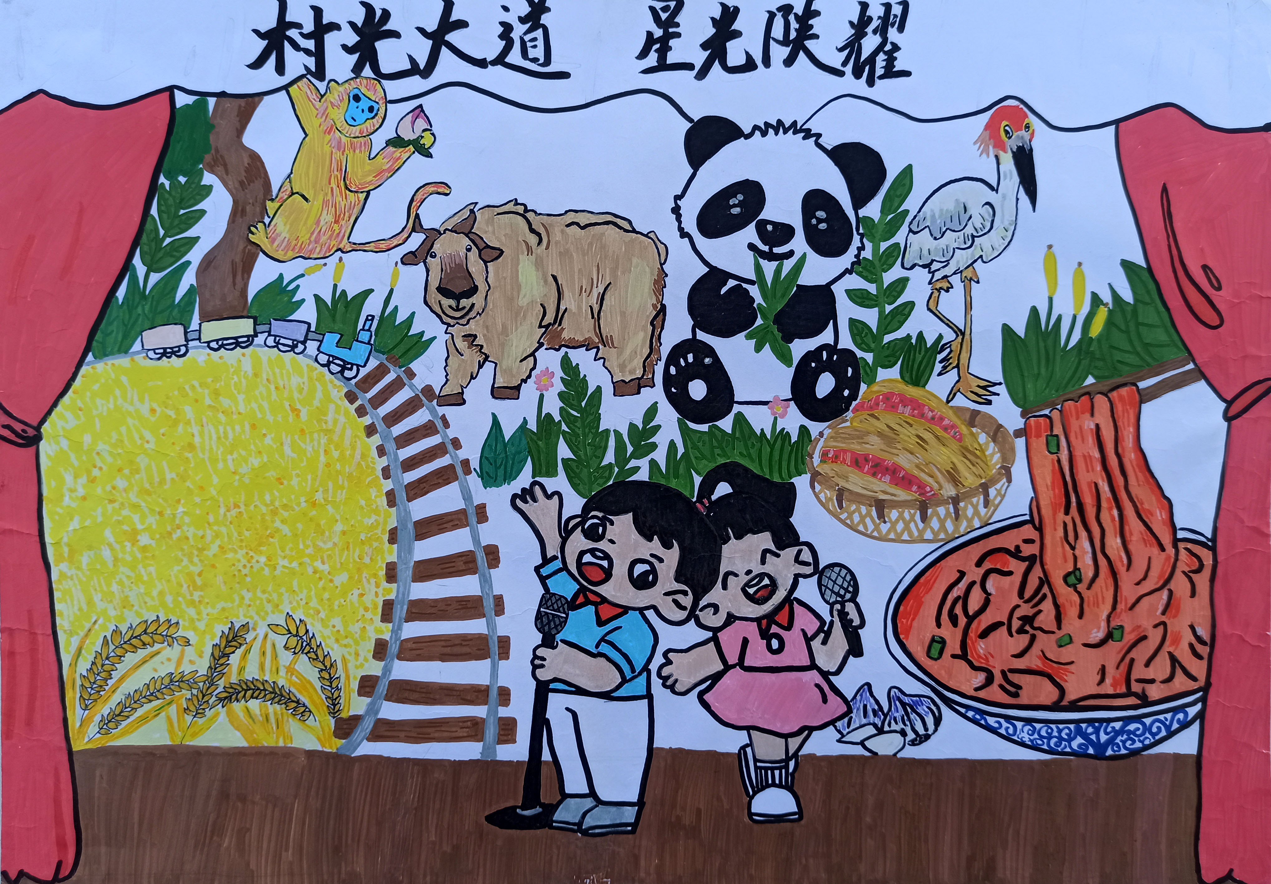 作品以 “村光大道 星光闪耀” 为引,勾勒出宁陕 “生态与生活共生” 的鲜活图景。画面中,秦岭特有的金丝猴、羚牛、熊猫、朱鹮自在栖息,是宁陕作为 “生物基因库” 的生态底色;金黄的稻田、地道的美食,是这片土地滋养出的生活烟火;孩童的欢唱与穿梭的小火车,则串联起宁陕的自然之美与人文温度。创作将宁陕的生态禀赋与乡土气息交融,既展现了这里 “山水养万物” 的自然馈赠,也传递出当地人在守护生态中收获的幸福。旨在以童趣的画面,定格宁陕 “生态为底、生活为韵” 的独特印象 —— 它不仅是动植物的乐园,更是人与自然共织的 “星光村落”,让每一缕村光里,都藏着生态守护的温暖,也藏着生活向上的光亮。