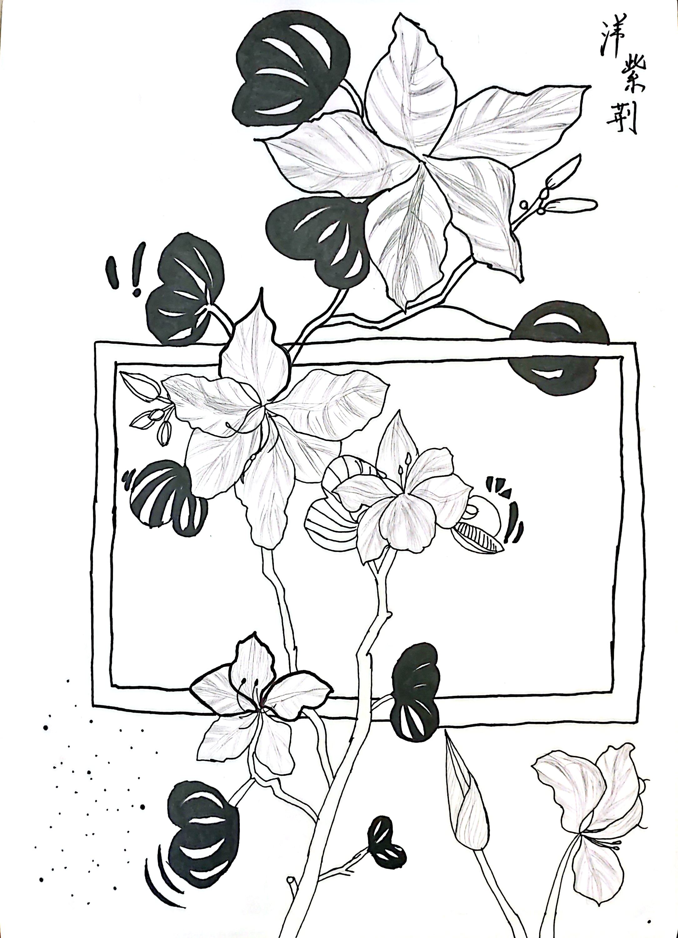 洋紫荆》以线描绘南国花卉,却藏着西北丝路的植物文化脉络。洋紫荆虽盛于岭南,其原生品种却经丝路从西域传入中原,而西北正是这条"植物丝路"的核心通道——汉代张骞通西域后,西域花卉(如葡萄、苜蓿)经西北传入内地,洋紫荆的传播也循此路径。画中花瓣的舒展造型、枝叶的卷曲线条,复刻了敦煌壁画里"西域花卉"的描绘技法,方框的构图则借鉴了西北民间"窗棂取景"的审美习惯。它将南国花卉转化为丝路植物迁徙的艺术载体,让花影的柔婉与线条的劲挺,凝成西北作为"植物文化枢纽"的生动见证,也让一朵花成为跨地域文明交流的微观缩影。