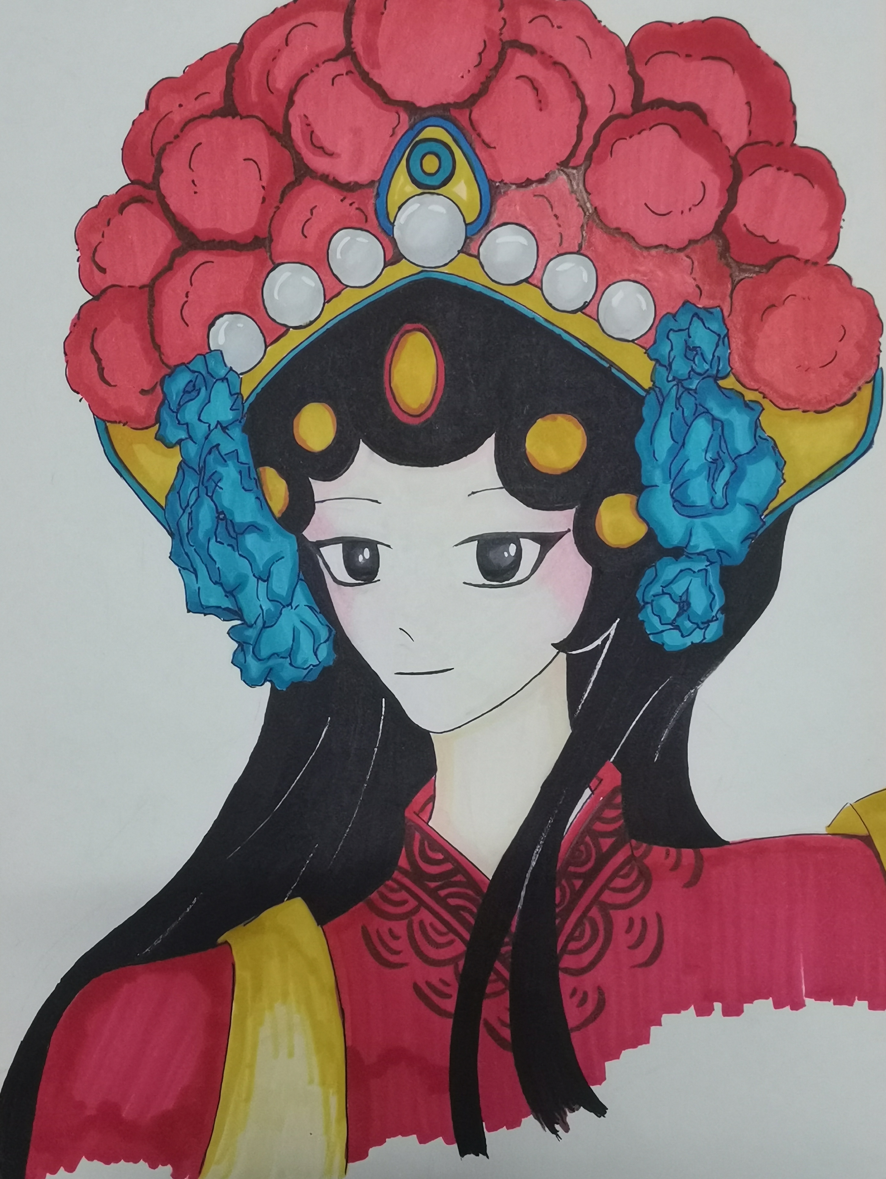 我在创作这幅画时,想到的是四川特有的文化川剧,川剧是中国西南部影响最大的地方剧种,2006年被列入第一批国家级非物质文化遗产名录 。同时我想塑造一个铁骨铮铮从容不迫的武旦形象,所以我参考了部分《战洪州》中穆桂英,又融入其本质特色:英气与柔美兼并,劲中带媚,刚柔相济等特点,创作出了这幅画。