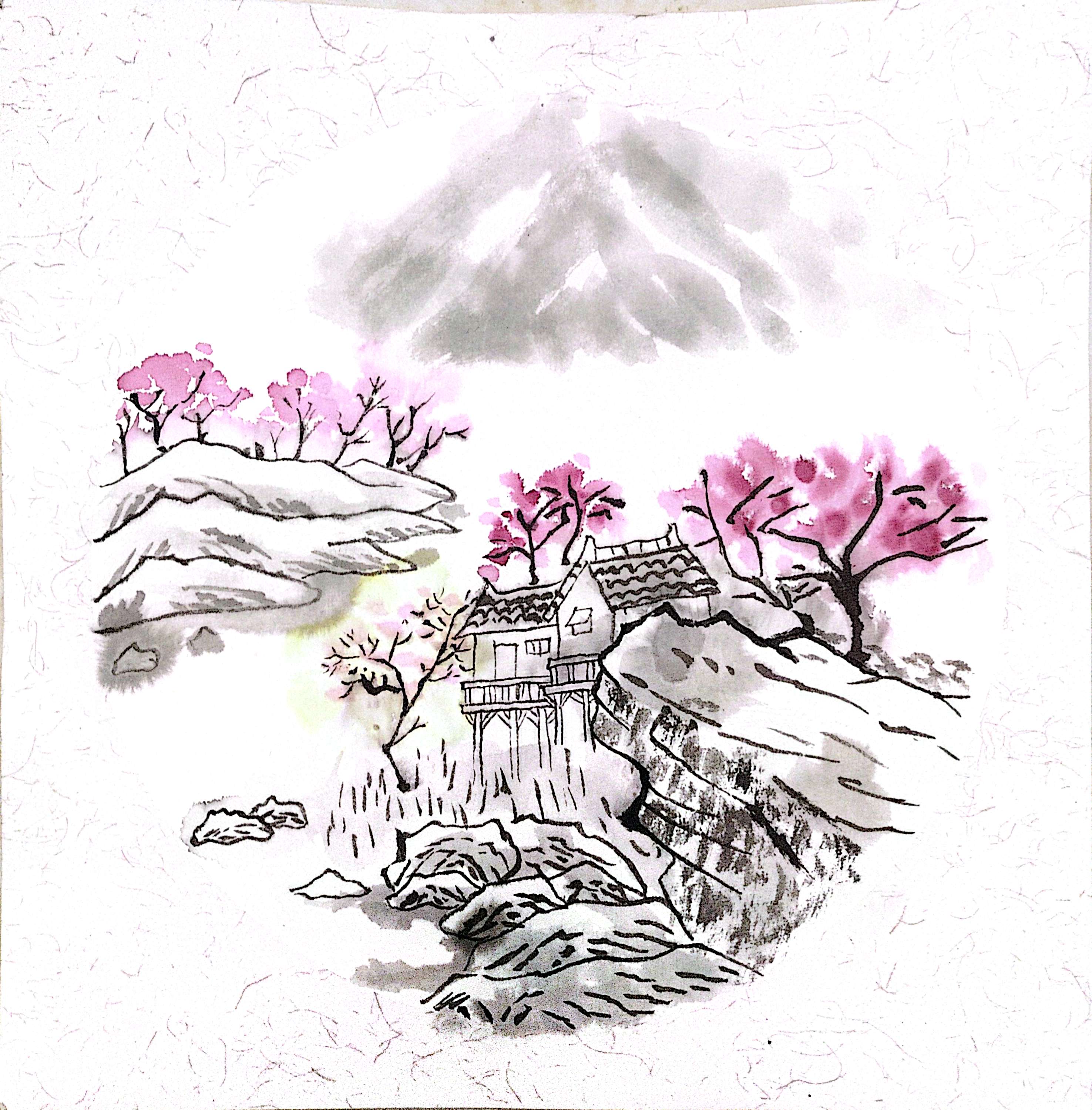 这幅画以水墨淡彩的形式,勾勒出春日山间的一隅景致:远山朦胧如黛,崖畔的木屋依岩而建,粉艳的花树点缀在雪融未消的坡岸间,既保留了传统山水的写意意境,又以鲜亮的花色与素净的水墨形成反差,传递出春寒未尽时,山居生活的清寂与生机交织的氛围。