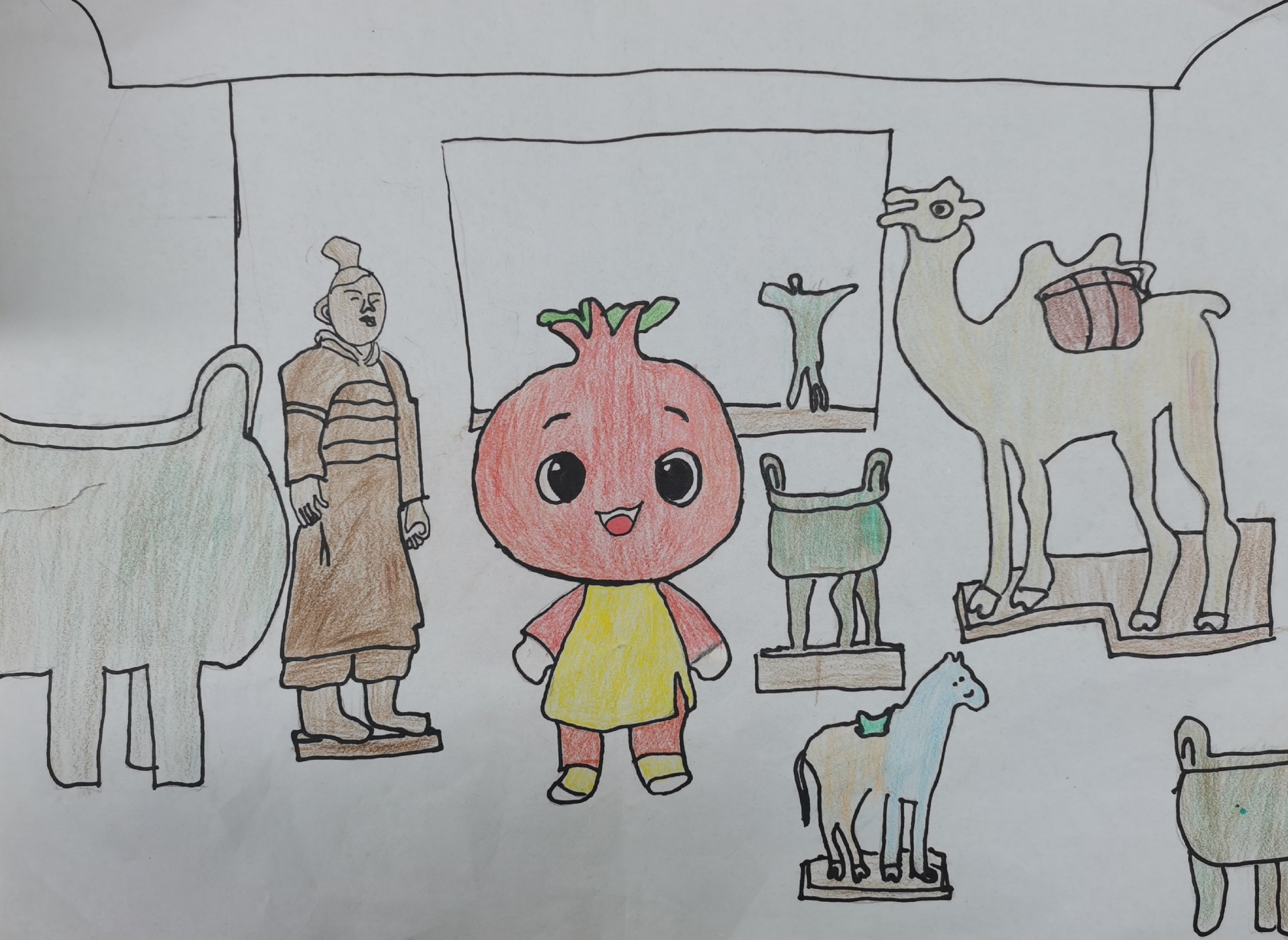 安吉祥物石榴娃娃,揣着小本本打卡西安文物。先冲兵马俑阵,踮脚和俑士比身高,在本本画颗星:“打卡秦代酷卫士!” 转身扑向青铜器,摸着凉凉的纹路,画下第二颗星:“打卡千年工艺宝!”最后站在唐三彩前,对着彩马眨眨眼,添上第三颗星:“打卡长安艳色彩!” 三本打卡完成,石榴娃娃晃着红裙摆笑:古都文物真亮眼,每处都是好风景!