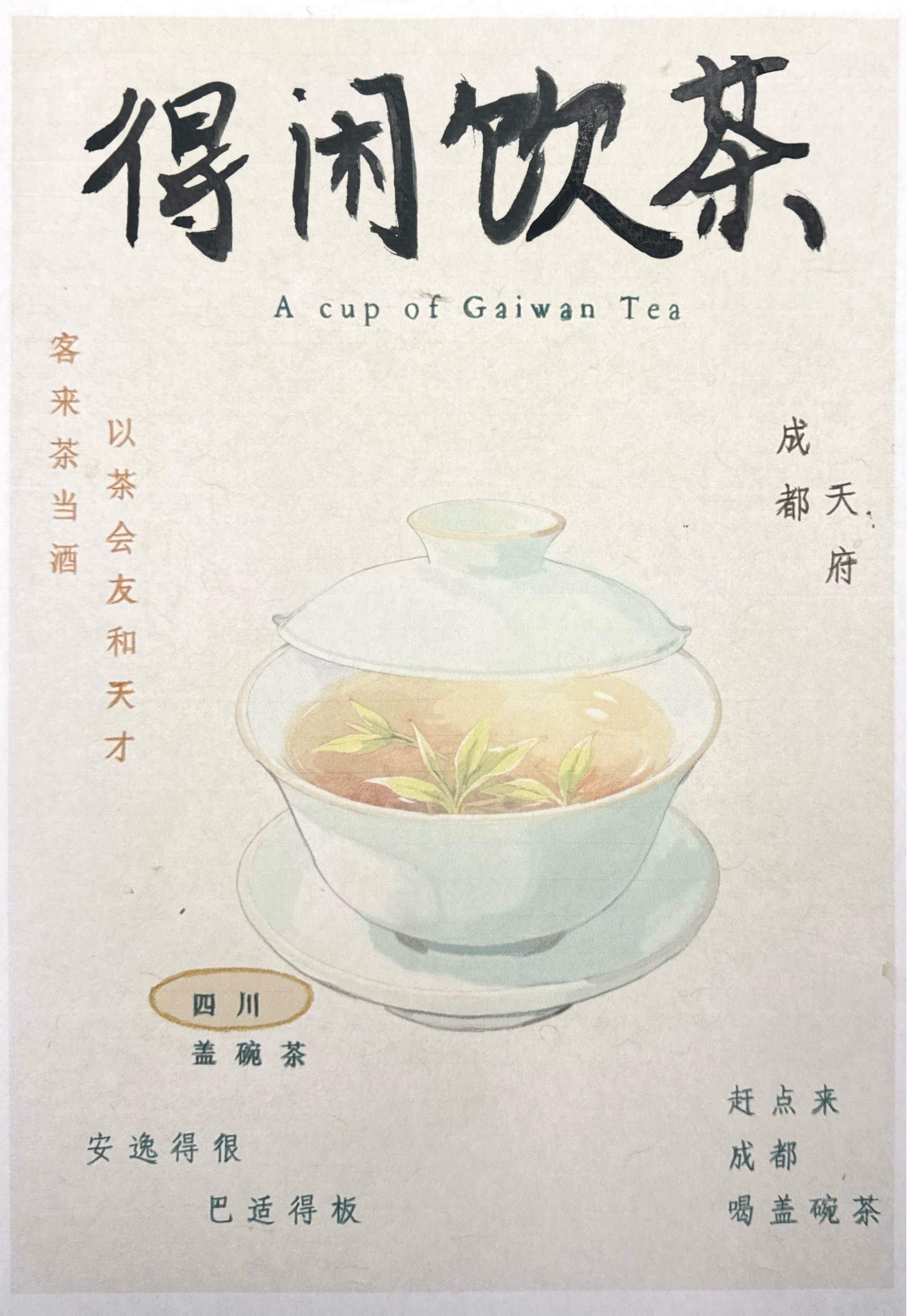 视觉锚点:以水彩质感的盖碗茶为核心,还原四川盖碗“三才碗”(盖为天、碗为人、托为地)的形制,茶汤里舒展的茶叶既显茶味鲜活,也暗合“慢下来”的生活节奏。 文字呼应:用书法字“得闲饮茶”点明主题,搭配“客来茶当酒”“安逸得很”等川渝方言与茶俗谚语,既保留地域文化标识,也让松弛的市井氛围更具象;“天府成都”“四川盖碗茶”则强化地域属性。 氛围营造:做旧纸张底色+轻复古排版,弱化商业感,让海报像老友递来的“茶约邀请”,传递四川人“以茶会友、把日子过巴适”的生活哲学。