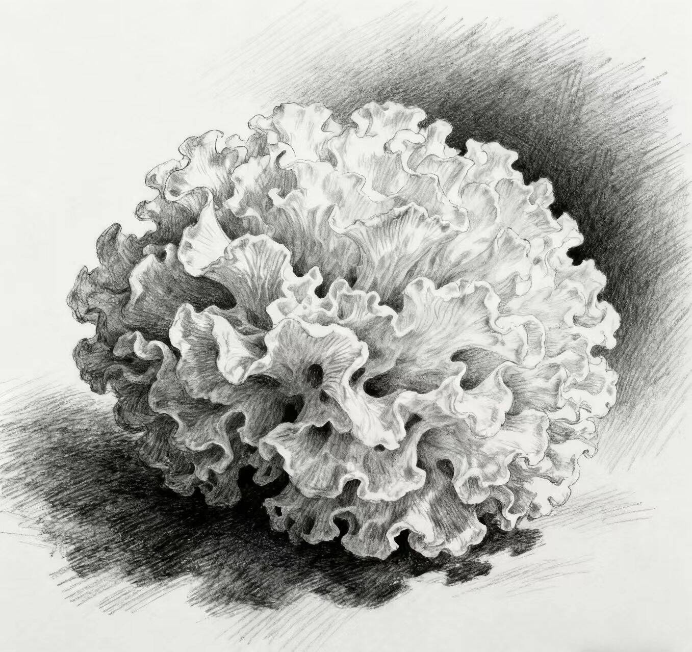 以返璞归真的黑白素描,深情刻画一朵故乡的银耳。其名"乡耳",既指其形,更喻其神。它不仅是自然的造物,更是一只凝神倾听"乡音"的耳朵,一件承载深厚情感的容器。通过极致写实的笔触,艺术家将个人对故乡的眷恋与记忆,永久地封存在这朵洁白、温润的"乡愁"之中。