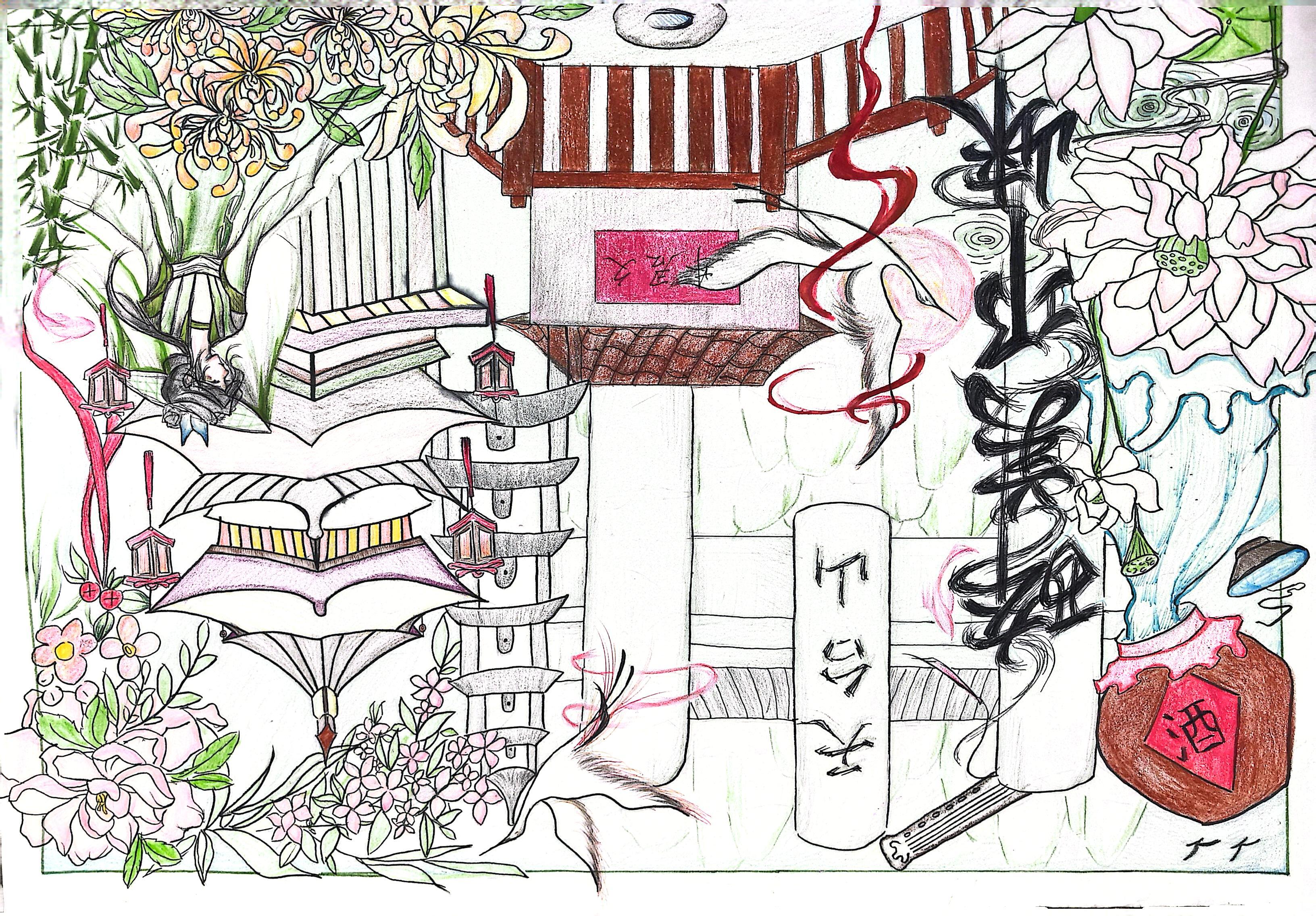 邛崃,一个成都西南部的小县城,这里没有城市的繁华但也没有城市的喧闹,但这些却让这个小县城有了孕育文化的安宁,这里有许多自然人文,有四大才女之一文君和那闻名的文君酒,文君井,有着独属邛崃的瓷器邛窑.有许多山,白鹤,天台.有受文化滋养的朴实的人民,我在画中表现了这些自然、文化.而这里是我土生土长的地方,我所爱的地方,我的家乡。