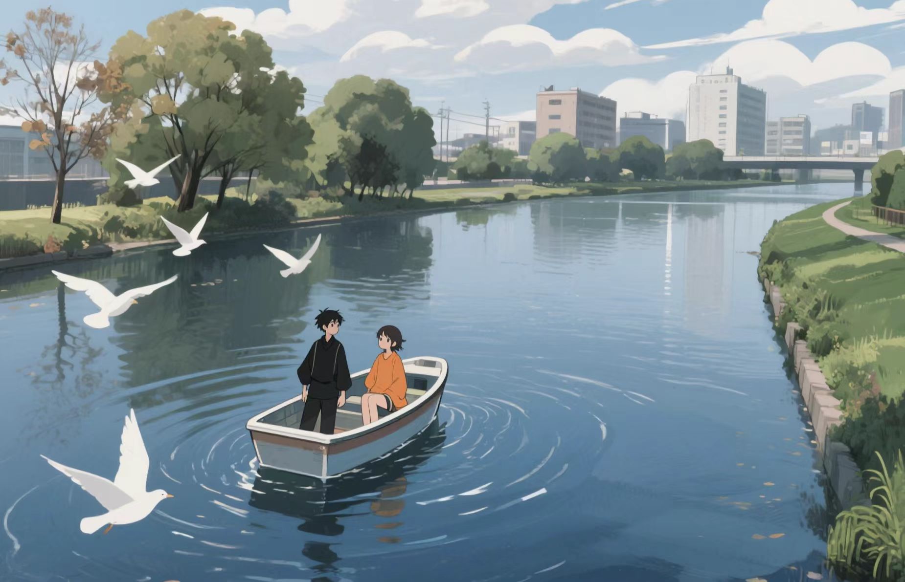 这种明亮清新的色调直接带给观者治愈、舒畅的心理感受,强化了作品希望传递的"治愈感"和"超脱日常的恬淡"。并通过精巧的构图、对比的手法以及对人物和谐状态的描绘,将一次简单的泛舟体验升华为一种生活哲学的表达:提醒我们在忙碌的现代生活中,不要忘记在身边寻找一片属于自己的"云水之间",去感受自然,安顿心灵。