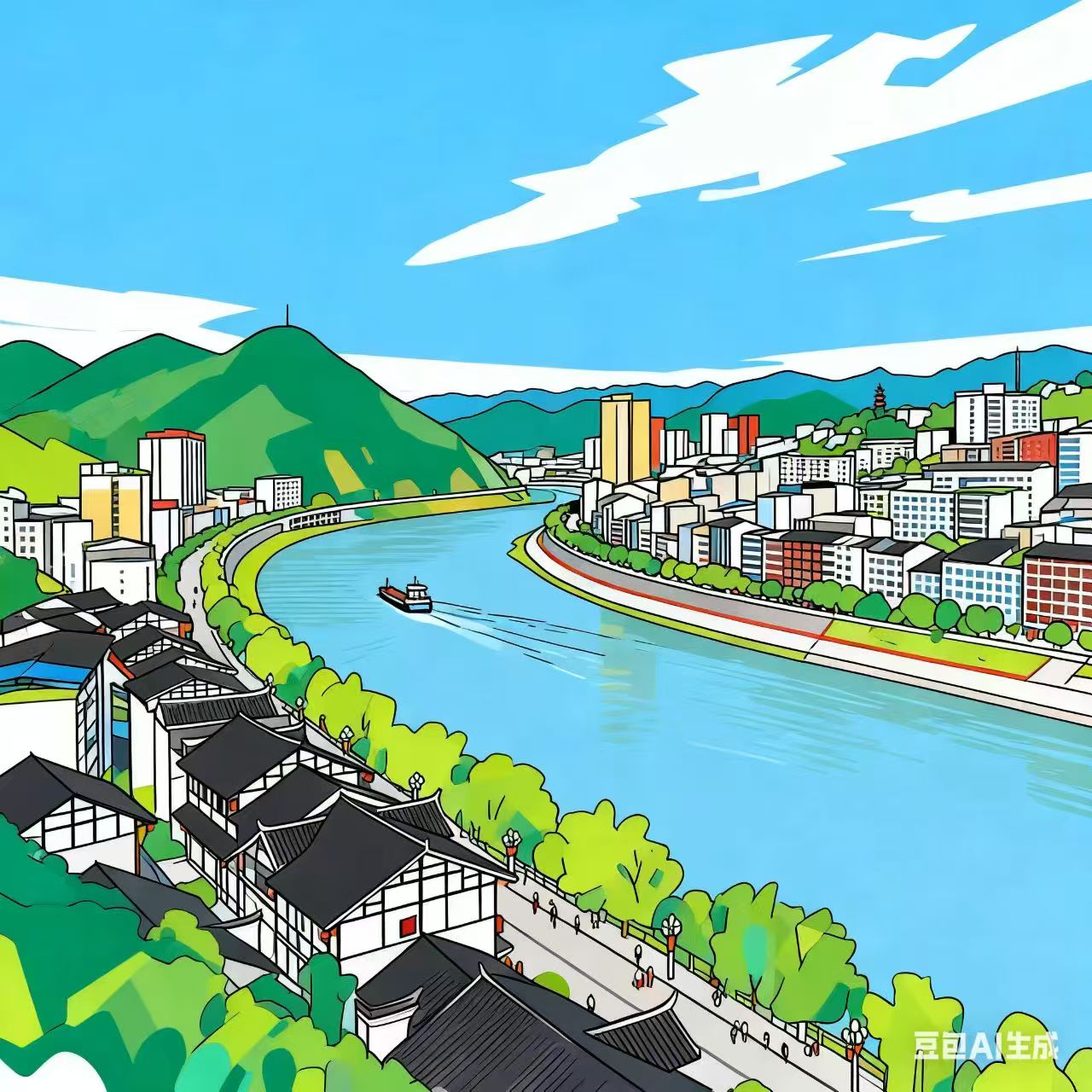 最想藏的细节是岸边长椅上的小人:不用画清模样,只留个"正慢慢走"的影子,就像这城的节奏——山在等云,水在载船,日子在新旧建筑的缝隙里,不慌不忙地亮着。画完才觉出,这哪里是画风景,是把"烟火裹着山水长"的生活气,揉成了能捧在手里的颜色。