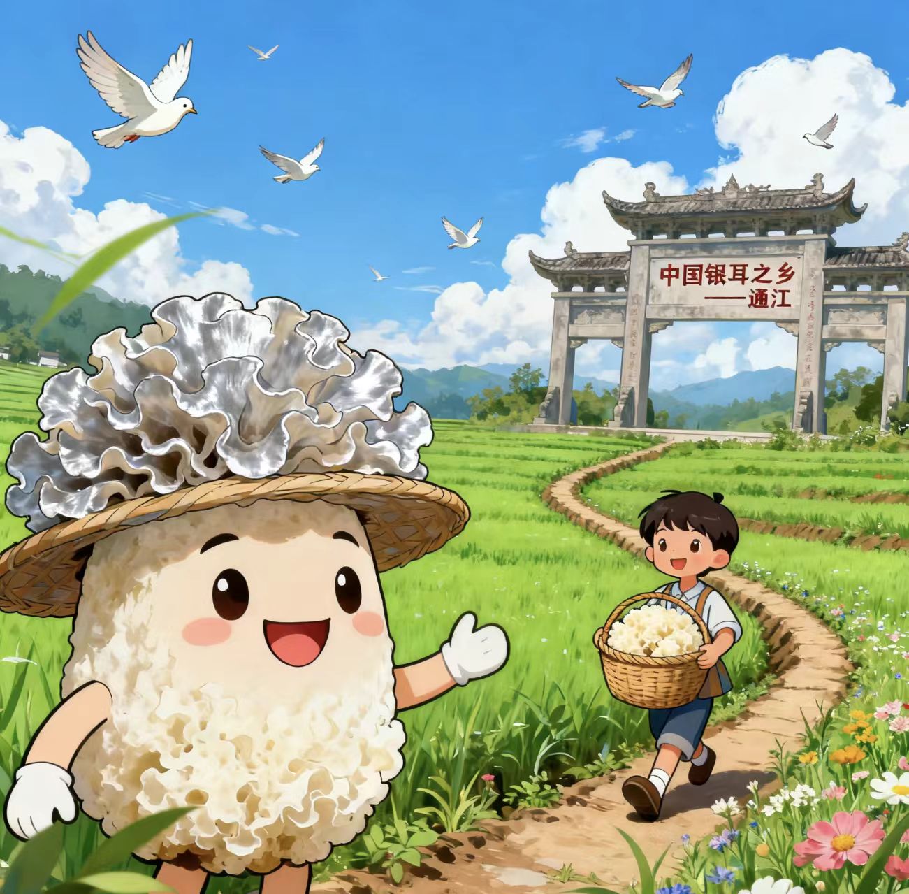 通过将代表通江优美生态的白云、象征祥和与生机的白鸽,以及核心品牌"银耳乡"这三个意象诗意地融合,以一种直观、优美且富有感染力的方式,向观众传递出通江作为银耳之乡的自然之美、物产之丰饶与生活之安宁的核心信息。