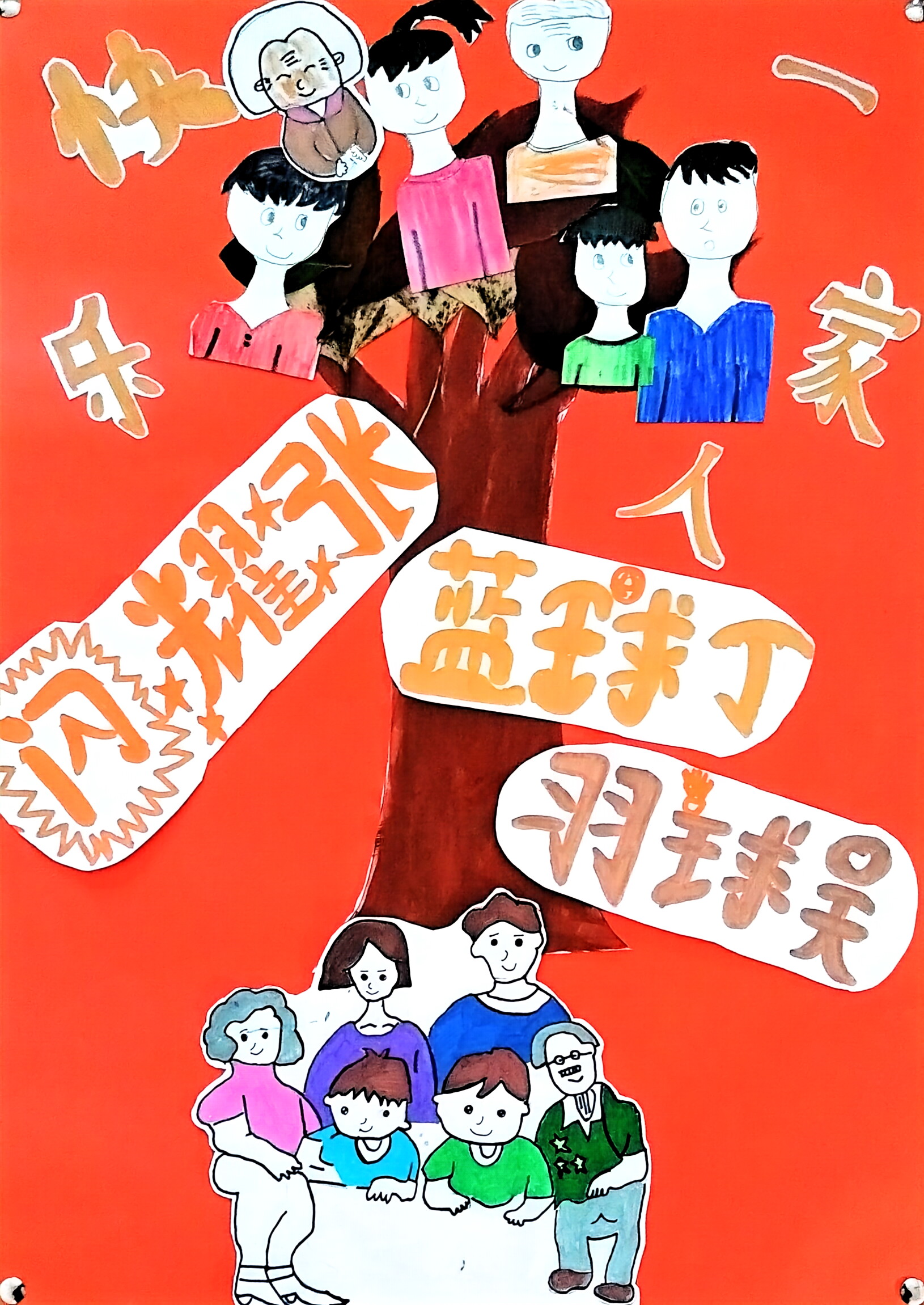 以落叶拼贴成家庭树,手绘家人形象分贴于枝叶与树下,搭配 “篮球丁”“羽球吴” 等趣味爱好标识,既借树象征家庭的温暖联结,又以红色底色 +“闪耀” 字样烘托欢乐氛围,让家人的共同生活与个**好在创意里鲜活交融。