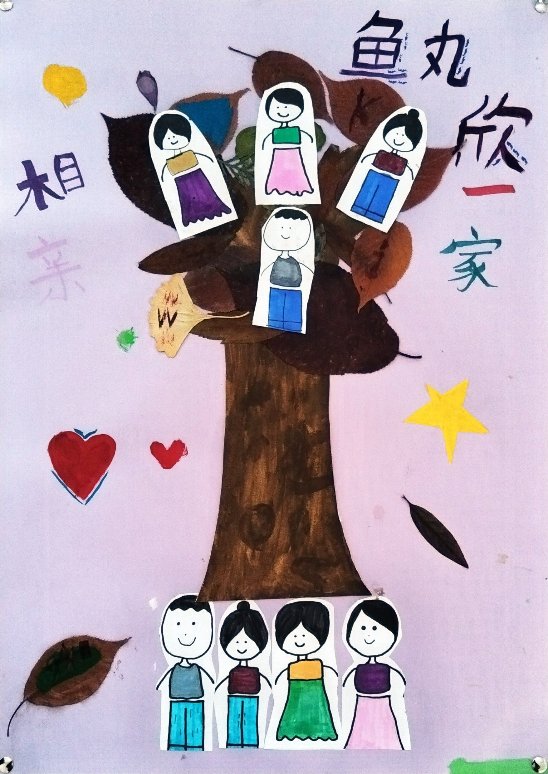 以落叶拼贴成家庭树,手绘家人形象(服饰色彩对应呼应成员)分贴于枝叶与树下,既借树的生长感象征家庭的紧密联结,又用 “鱼丸欣” 的专属昵称增添生活趣味,淡紫底色 + 爱心、星星装饰烘托温馨氛围,“相亲相爱” 字样点明主题,让家人的专属温情在创意拼贴里鲜活又可爱。